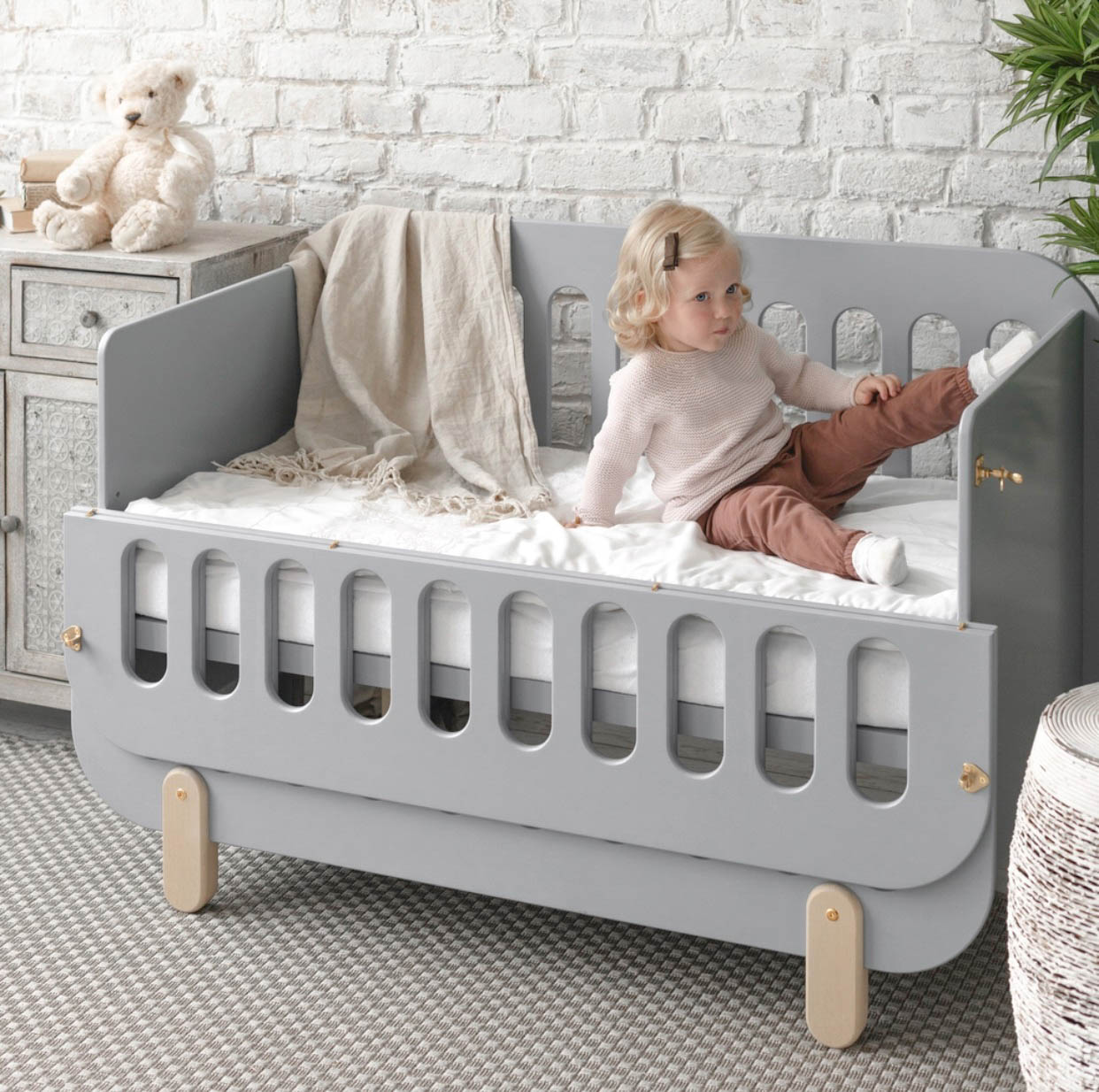 Кроватка с бортиками — тема деликатная. Многие держатся за неё до последнего, и мы понимаем почему: это же безопасность, это же уютно, это же. Но когда ребёнок начинает самостоятельно из неё выбираться — а он начнёт, и скорее всего в самый неподходящий момент — бортики перестают быть защитой и становятся препятствием для курса молодого бойца. Переход на кровать без бортиков или на низкую кровать-домик — это не страшно. Или тоже изначально выбрать трансформер.