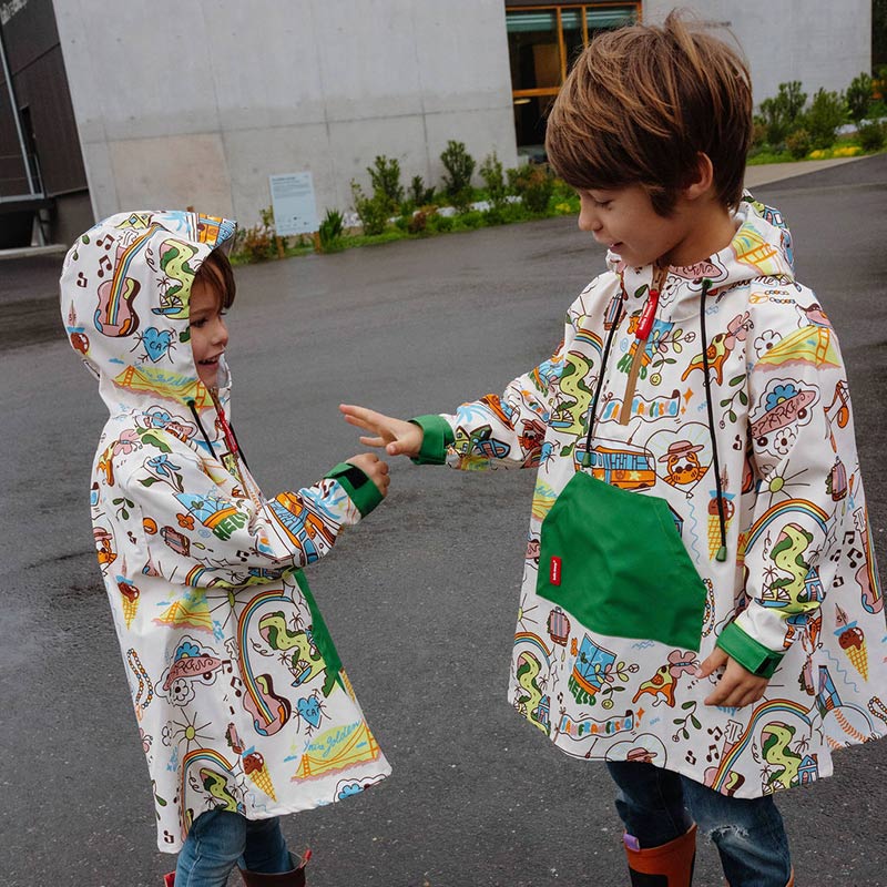 Французы, которые делают жизнерадостные дождевики. Ткань сертифицирована как водонепроницаемая, принты — весёлые и смелые, детям точно понравится. В уходе неприхотливы, но лучше стирать вручную и не злоупотреблять отжимом. Хороший вариант для активных прогулок.