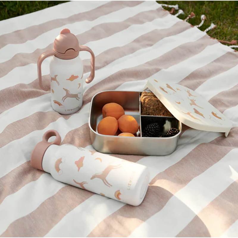 Теперь немного о воде. Много воды. Пить, поливать, плескаться, охлаждаться — вода в жару становится нашим лучшим другом. Но уговорить малыша пить каждые полчаса — не самая простая задача. Тут на помощь приходят симпатичные бутылочки, которые удобно держать даже детской ручкой. Некоторые ещё и с трубочкой, с которой так весело играть — и заодно пить воду, не замечая. Особенно здорово, если бутылочка сохраняет прохладу — есть такие, с двойными стенками или охлаждающими элементами. Если собираетесь на долгую прогулку с перекусом, термосумка — must-have. В ней и вода останется прохладной, и фрукты не превратятся в компот через полчаса.