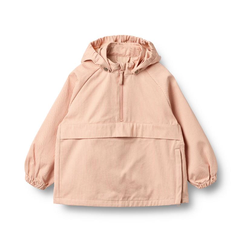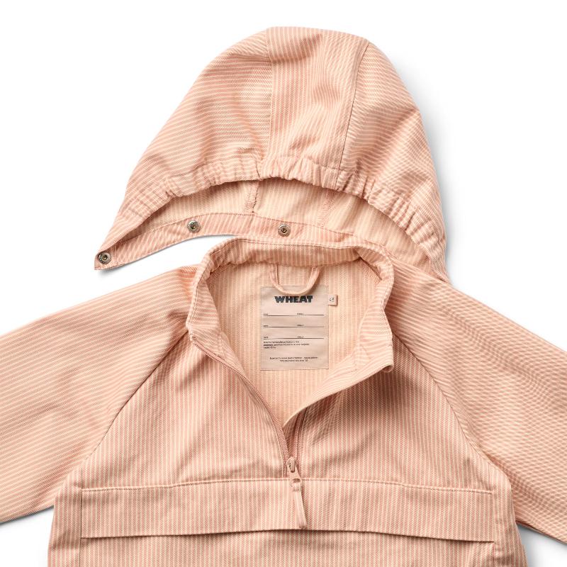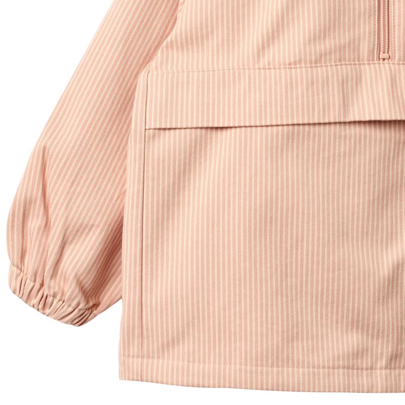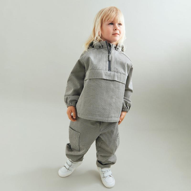 Анорак в полоску из водоотталкивающей дышащей ткани. Молния застегивается не до конца, надевается через голову. Регулируемый капюшон, карман-кенгуру спереди. Легкий, компактный, не занимает много места. Подходит для весны, лета, ранней осени. Защищает от ветра и небольшого дождя. Удобен для прогулок, пляжа, поездок. Свободный крой дает комфорт при активных играх. Практичная альтернатива обычной куртке.
