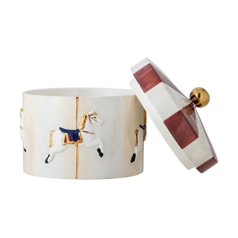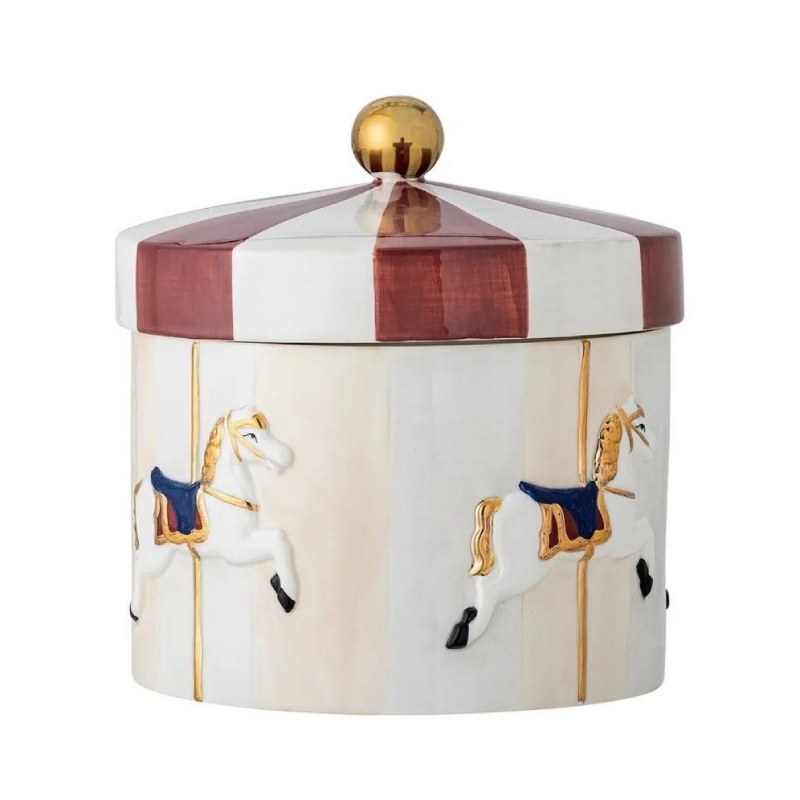 Керамическая баночка сочетает кремовый фон и красные акценты, напоминая о приятных сезонных коллекциях. Крышка фиксируется плотно, что делает баночку удобной для хранения сладостей, небольших аксессуаров или просто как декоративного элемента. Её форма и рисунок создают мягкое, жизнерадостное настроение на кухне.