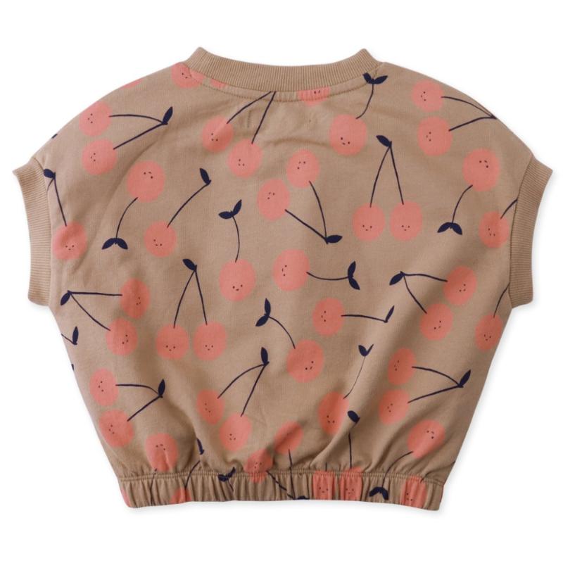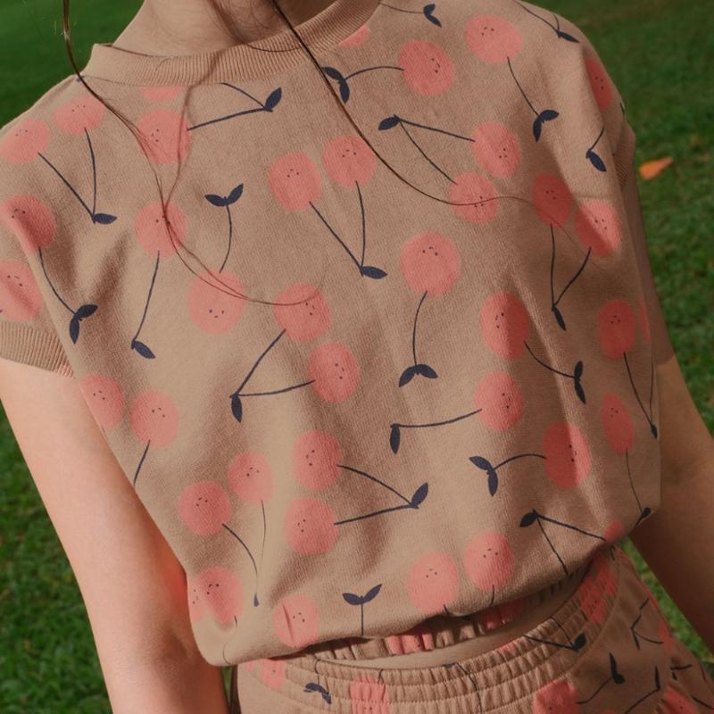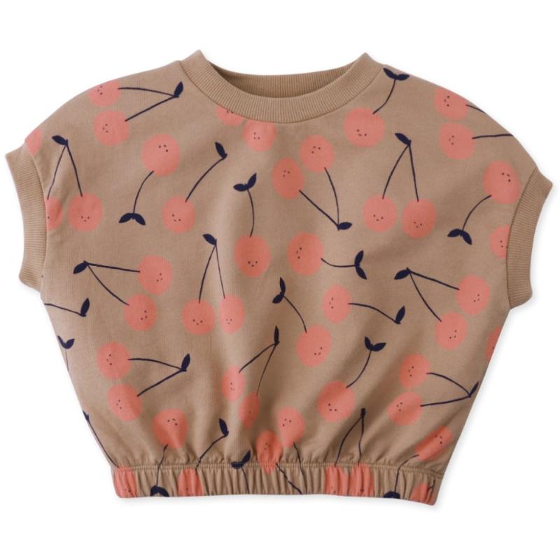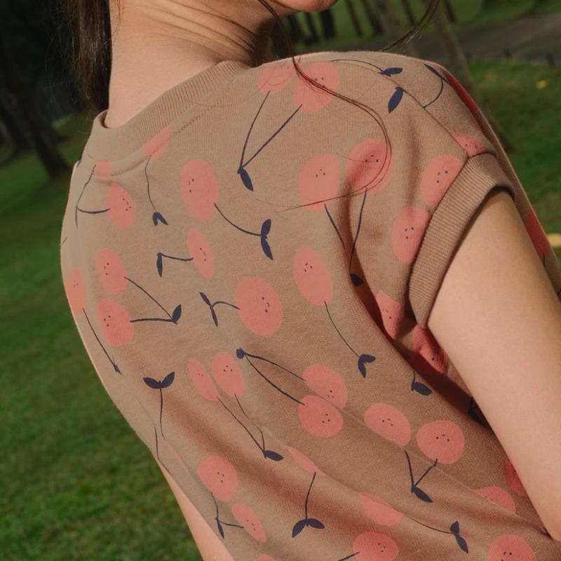 Мягкая махровая блуза цвета какао, а на ней — веселые вишенки. Рукава короткие и свободные — ничего не жмет. А низ на резинке — это маленькая хитрость: блуза не вылезает из штанов, не сбивается комом, всегда сидит как надо. Ткань нежная, мягкая, как любимая пижама, но выглядит нарядно — можно и дома, можно и на прогулку. Хорошо и с брюками в тон, и с любым другим низом.