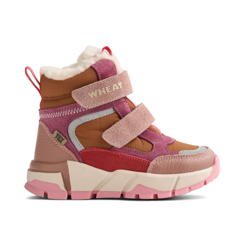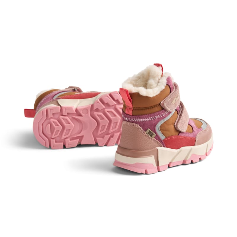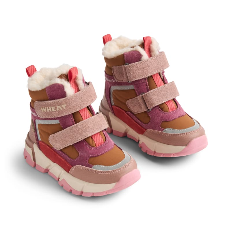 Лёгкие зимние ботинки для активных прогулок — мягкие внутри и прочные снаружи. Шерстяная подкладка сохраняет тепло, мембрана Tex защищает от влаги, а резиновая подошва предотвращает скольжение. Застёжка на липучках упрощает надевание, делая модель удобной даже для малышей. Оттенок «розовая акварель» добавляет нежности, но остаётся практичным: обувь хорошо сочетается с верхней одеждой и аксессуарами любого цвета.