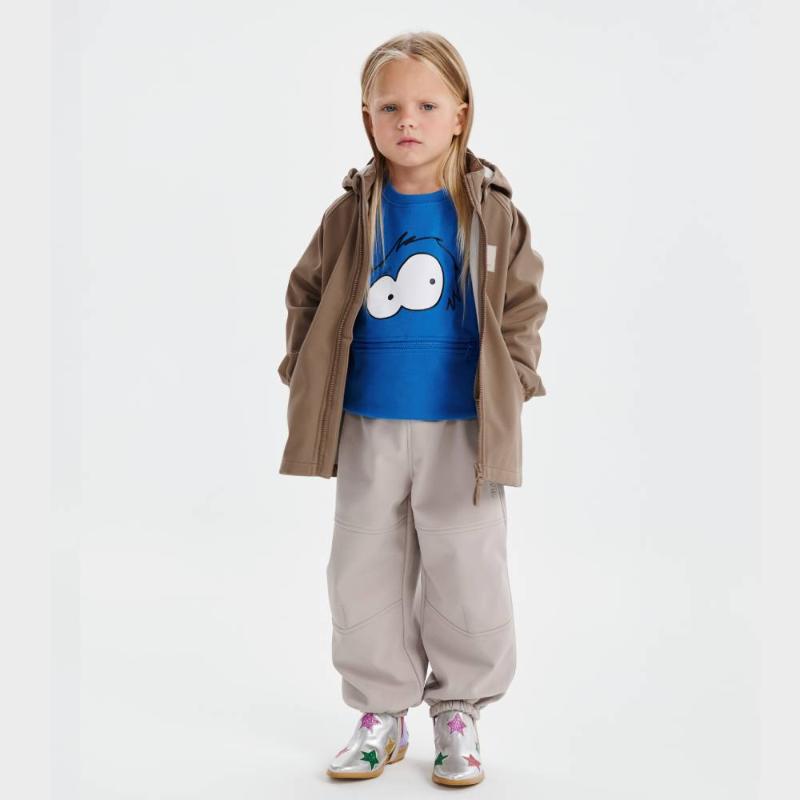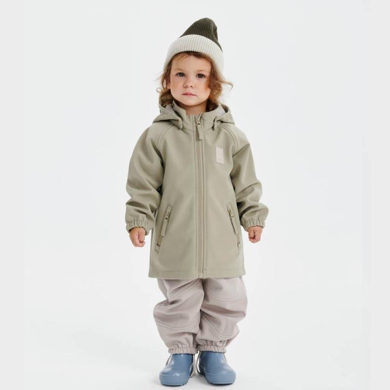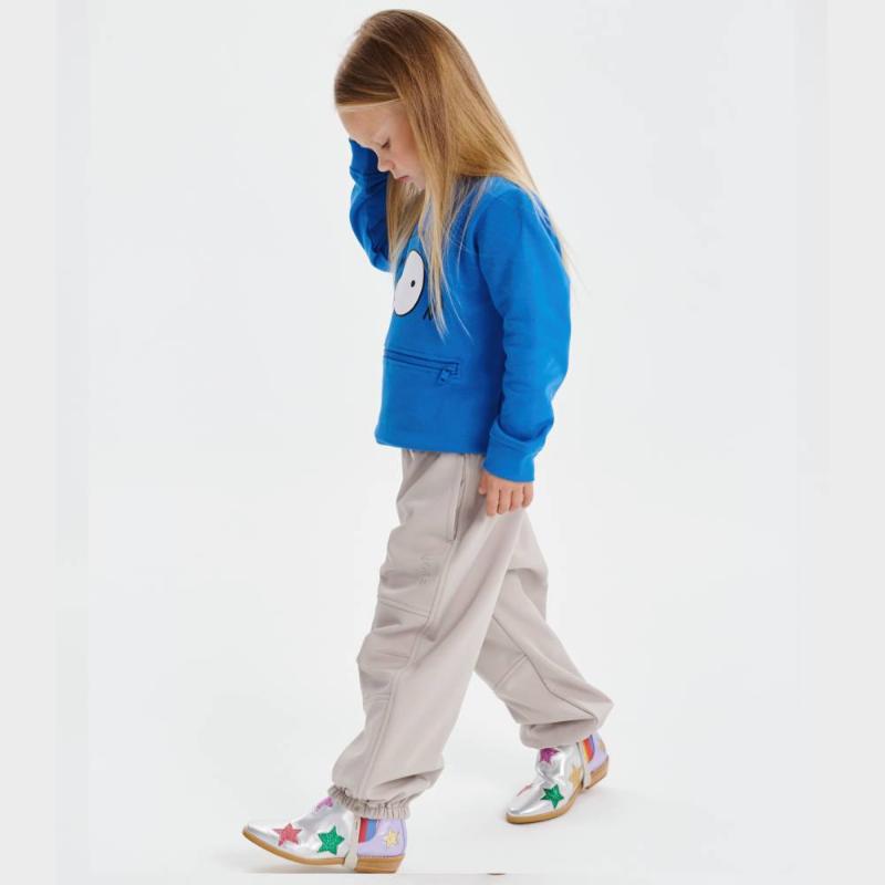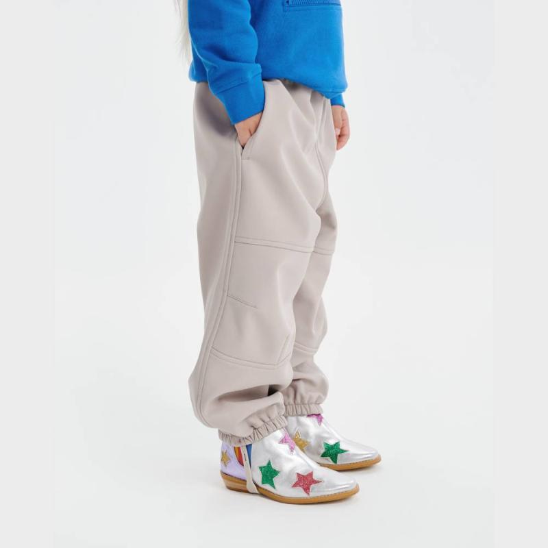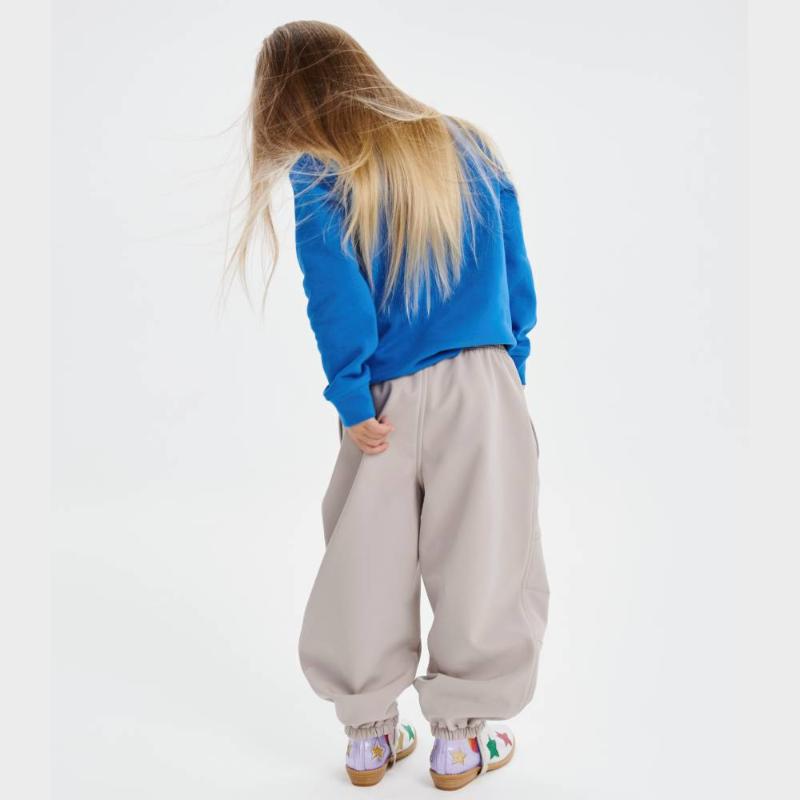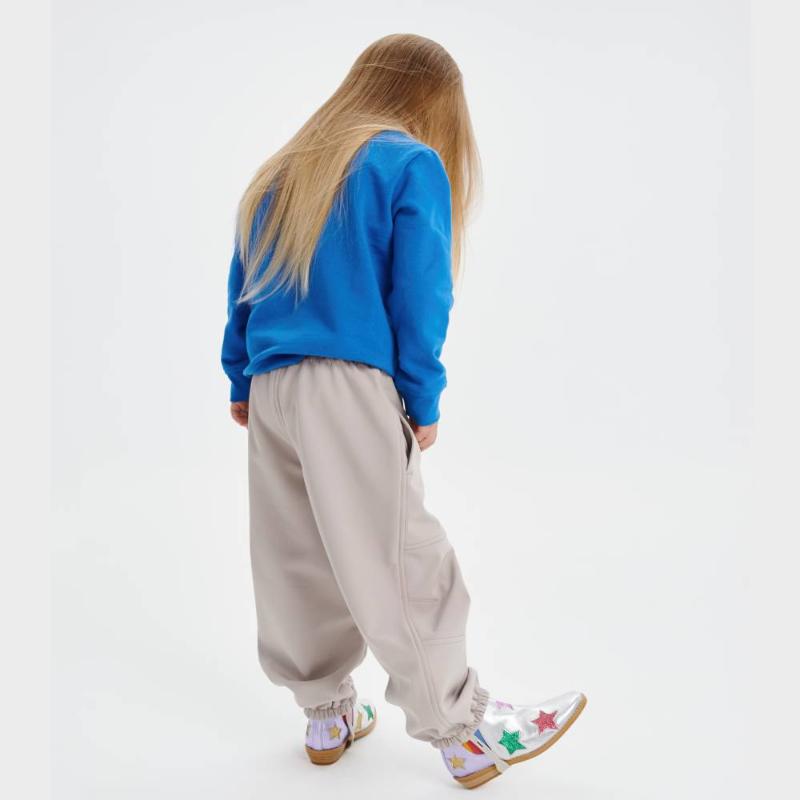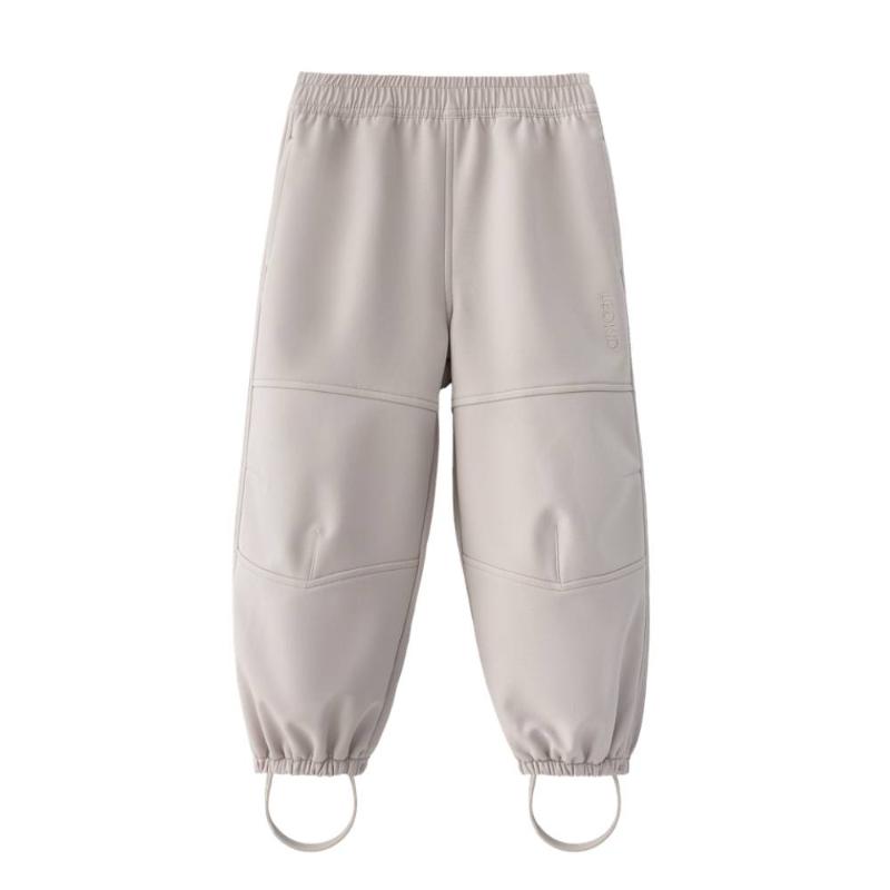 Брюки из трехслойного материала для переменчивой погоды от +5 до +18 °C. Снаружи — водоотталкивающее покрытие, внутри — мягкий флис, а между ними дышащая мембрана, которая выводит лишнее тепло при активных играх. Пояс на резинке регулируется изнутри под фигуру ребенка. Два боковых кармана, съемные силиконовые штрипки по низу штанин.