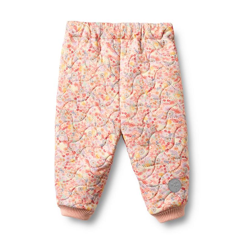 Термобрюки с принтом фруктов и цветов — популярная модель. Трехслойная стеганая конструкция держит тепло, материал дышит. Водоотталкивающие, подходят для сухой погоды или под дождевые штаны. Эластичный пояс тянется, не давит на живот. Резинки внизу фиксируют длину. Есть светоотражатели. Мягкая ткань комфортна для кожи. Обеспечивают свободу движений. Из переработанного полиэстера. Сочетаются с термокурткой. Для переходного сезона.