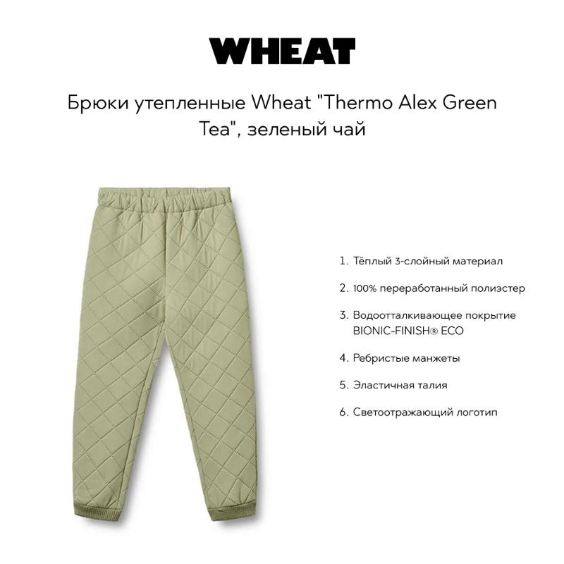 Утепленные брюки с красивым оттенком зеленого чая — отличный выбор для холодной погоды. Они оснащены водоотталкивающими свойствами и теплым внутренним слоем для защиты от холода и дождя. Регулируемый пояс и манжеты обеспечат идеальную посадку и комфорт. Прочный материал гарантирует долговечность, а стильный цвет подойдет как для прогулок, так и для активных игр на свежем воздухе.