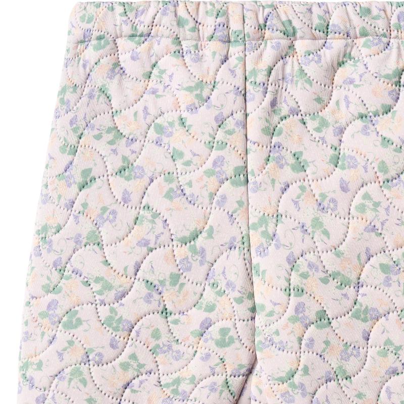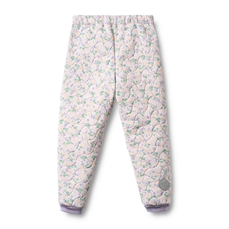 Фиолетовые термо-брюки с крупными петуниями. Три слоя стеганой ткани обеспечивают изоляцию и комфорт. Дышащие, отводят лишнее тепло от тела. Отталкивают влагу, но не заменяют дождевик в мокрую погоду. Широкая резинка на талии для удобной посадки. Резинки внизу держат брюки на месте. Светоотражающие детали для безопасности. Мягкие, не мешают бегать и прыгать. Красиво смотрятся с курткой в тон. Для весны и осени. Машинная стирка.