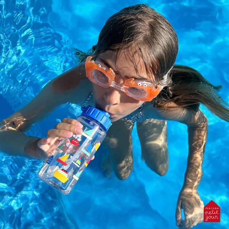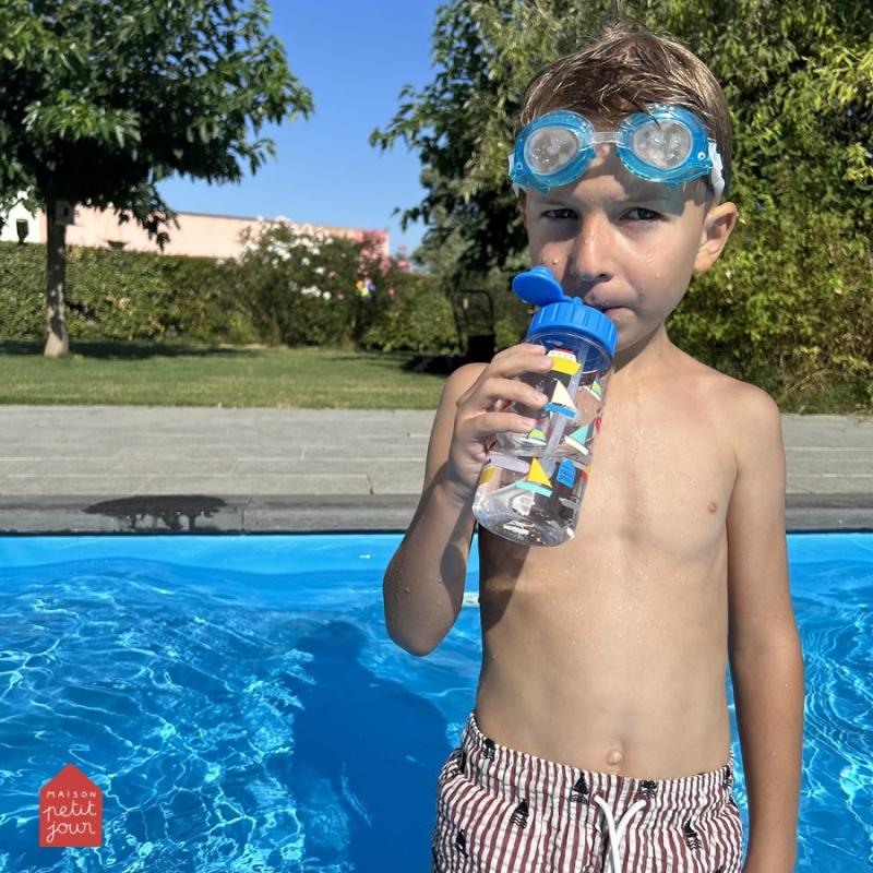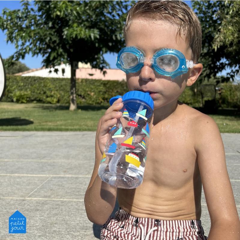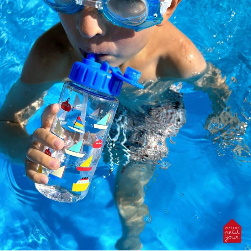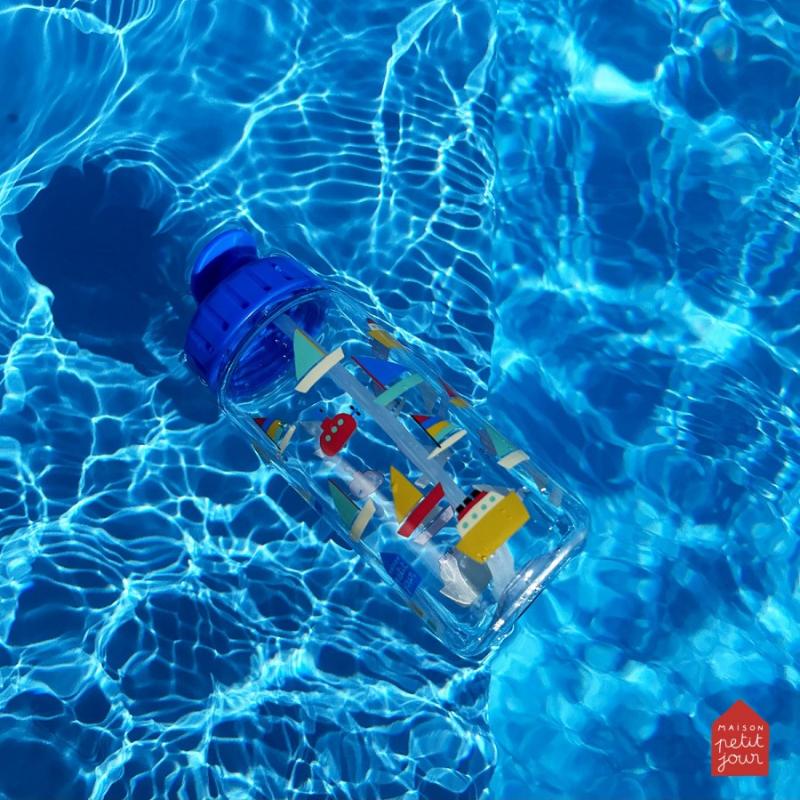 Пластиковая бутылка с крышкой на резьбе и трубкой для питья. Подходит для прогулки, школы или занятий. На бутылке нарисованы кораблики в голубых тонах. Крышка закручивается плотно, вода не прольется в рюкзаке. Трубка удобная — можно пить на ходу. Бутылка легкая, не добавляет вес сумке. Горлышко широкое, легко мыть внутри. Материал прочный, выдерживает падения. Подходит для воды, сока или компота. Удобно брать с собой каждый день.