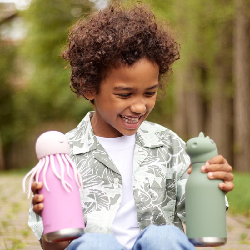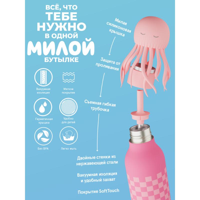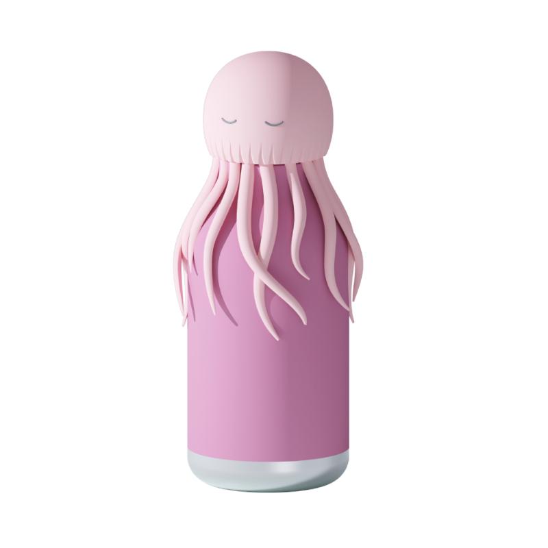 Фиолетовый термос с медузой на крышке — объёмная силиконовая голова с щупальцами превращает бутылку в морское приключение. Двустенная конструкция сохраняет температуру напитков, мягкая поверхность удобна в использовании, соломинка в комплекте. Подводный житель для наземных будней. Необычный дизайн для тех, кто предпочитает выделяться из толпы стандартных термосов.