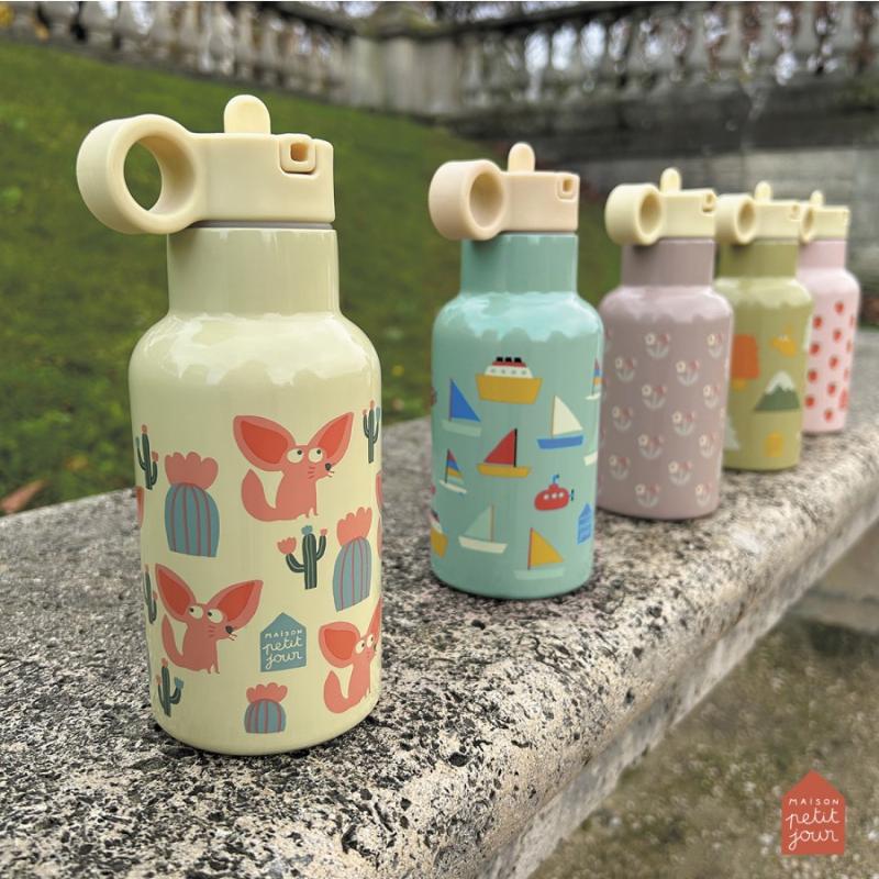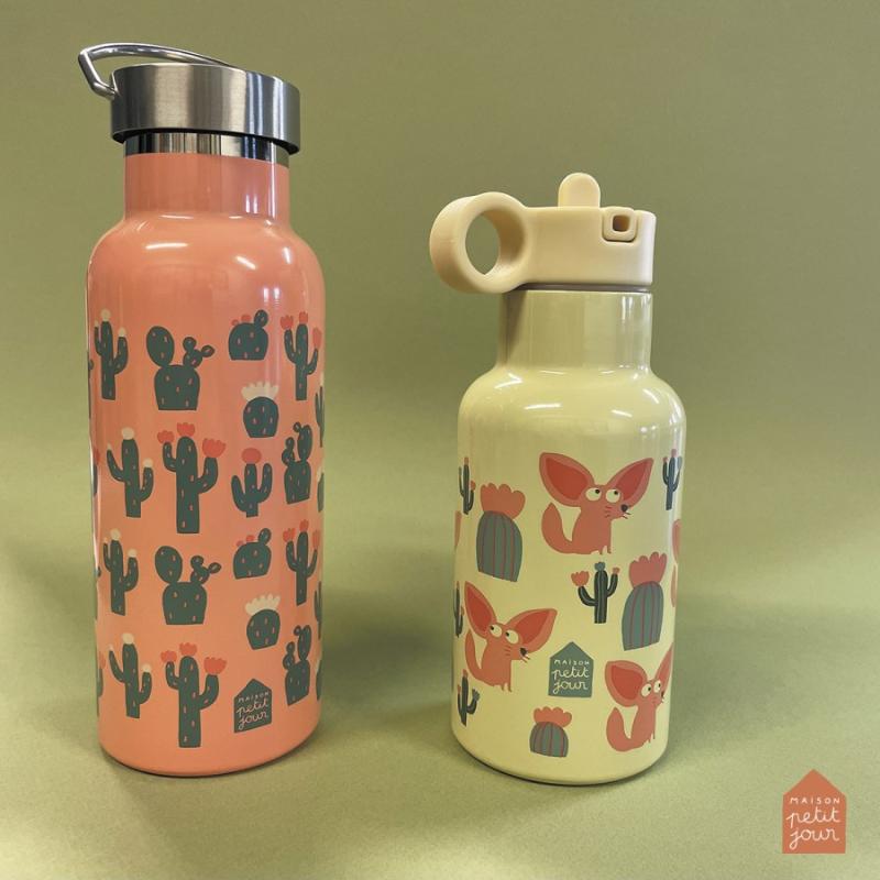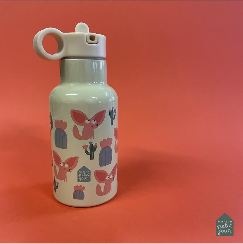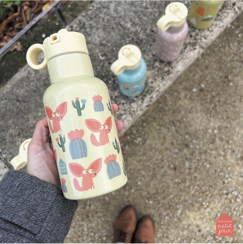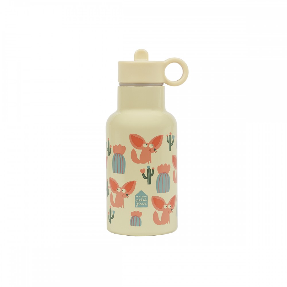 Термос из металла с двойными стенками держит холод до 10 часов, а тепло до 5 часов. Напитки останутся нужной температуры на всю прогулку. Крышка с трубкой позволяет пить на ходу, не проливая. Песочный цвет с рисунками лисы фенек смотрится мило и необычно. Фенек — это пустынная лиса с большими ушами. Горлышко широкое, легко мыть внутри. Материал прочный, выдерживает падения. Удобно носить в рюкзаке. Подходит для воды, сока, чая или других напитков.