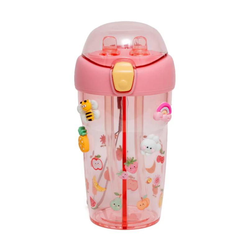 Двухсекционная бутылочка в розовом цвете с сочными фруктами — практично и весело. Одна половина для воды, вторая для компота или сока — ребёнок сам выбирает, что пить в данный момент. Соломинки складываются внутрь крышки, не мешаются. Петля для подвешивания к сумке или поясу. Материал прочный, устойчив к падениям, легко моется.