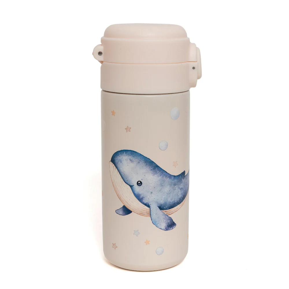 Термобутылка с китом на бежевом фоне — сохраняет холод до 12 часов, тепло до 6. Корпус из нержавеющей стали, не бьётся. Крышка герметичная, не протекает при тряске. Объём 350 мл подходит для долгих прогулок. Горлышко достаточно широкое для мытья. Безопасна, не содержит токсичных покрытий.