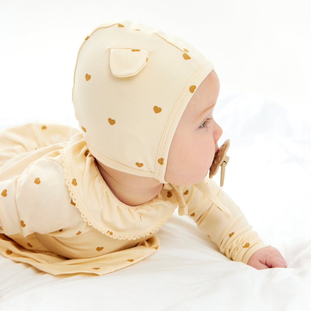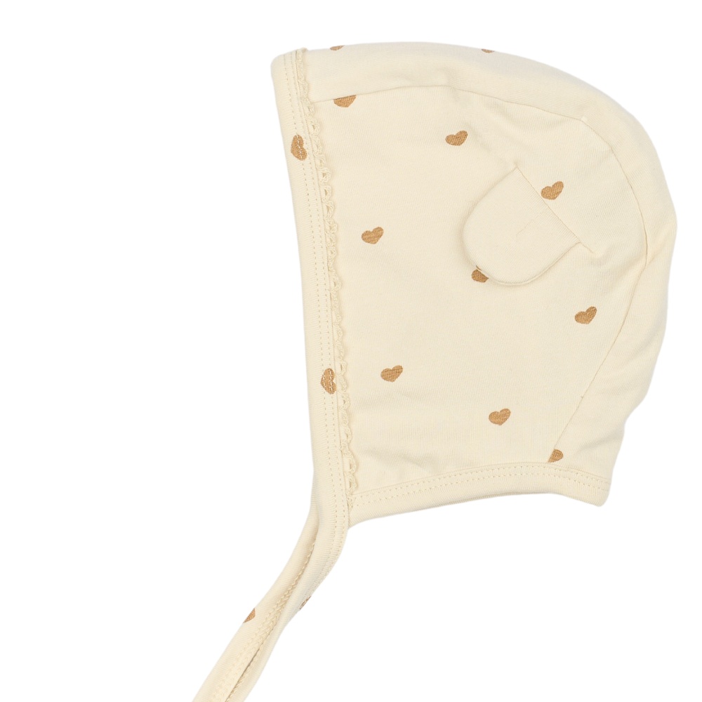 Чепчик для новорожденных — это не только стильный аксессуар, но и незаменимый элемент гардероба для малышей. Изготовленный из мягкого и дышащего материала, он не вызывает дискомфорта и надежно защищает головку ребенка от холода. Принт ванильных сердец придает чепчику нежность и очарование, а эластичные края обеспечивают удобную посадку и легкость в использовании.