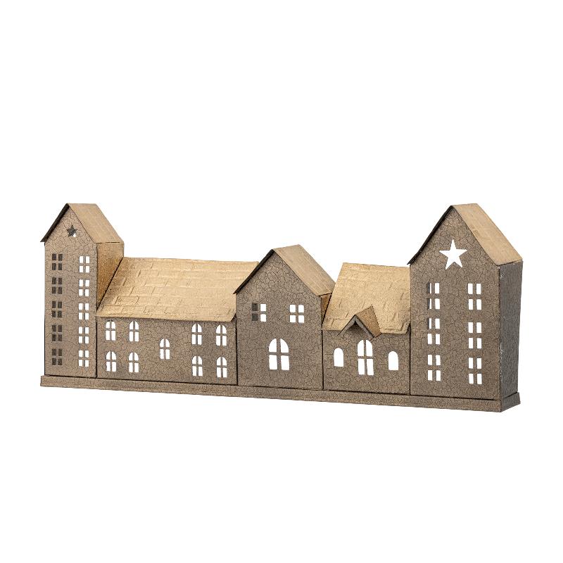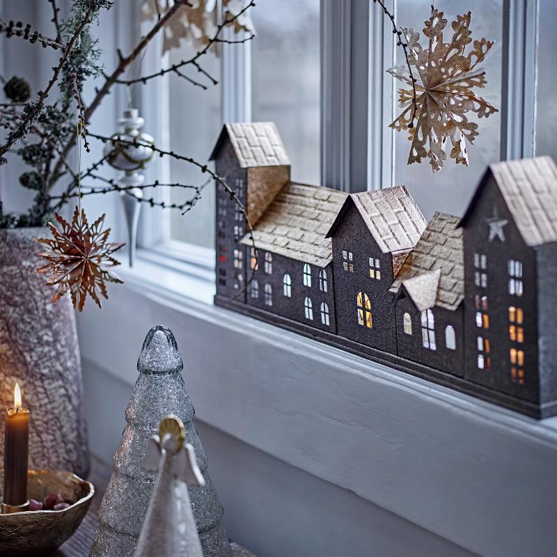 Металлическое строение Noeli напоминает ряд маленьких домиков с резными окошками. Поставьте за ним LED-свечу — и получите камерный свет, который создаёт настроение, а не просто освещает пространство. Коричневая отделка добавляет теплоты, делает декор уместным не только зимой, но и круглый год. Отлично смотрится на подоконнике или полке, где нужен акцент без лишней громкости.