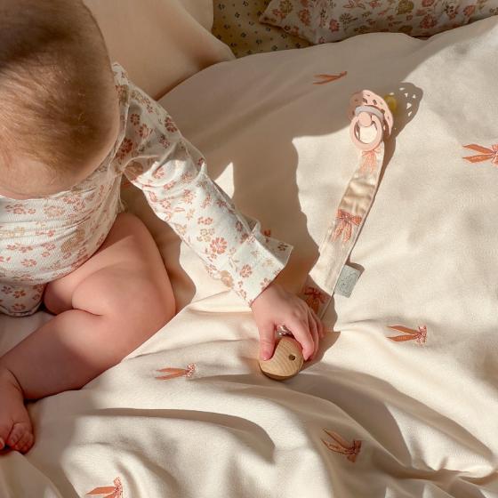 Этот держатель для пустышки из коллекции Bows отличается изящным кремовым оттенком и продуманным дизайном. Он надежно крепится к одежде малыша, предотвращая потерю пустышки и защищая её от загрязнений. Изготовлен из мягких, гипоаллергенных материалов, безопасных для нежной кожи ребенка. Такой аксессуар сочетает практичность и стиль, делая повседневное использование удобным для родителей и приятным для малыша. Его элегантный дизайн гармонично дополнит любой комплект.