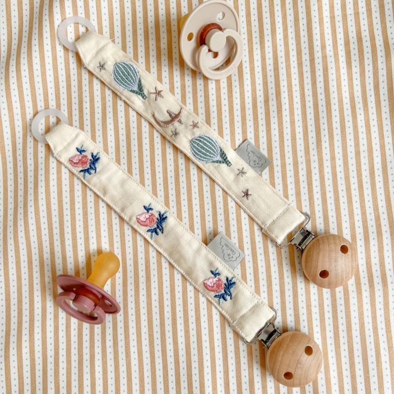 Держатель помогает сохранять пустышку чистой и всегда под рукой, особенно во время прогулок и сна. Он легко крепится к одежде и не мешает ребенку в движении. Аккуратная лента с вышивкой добавляет эстетичности повседневному аксессуару. Спокойный дизайн делает его универсальным решением для ежедневного использования дома и вне его.