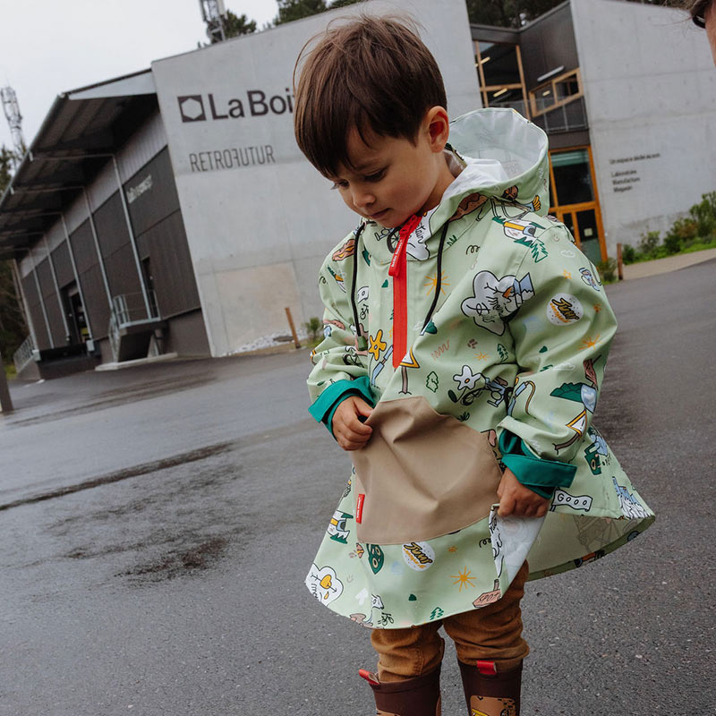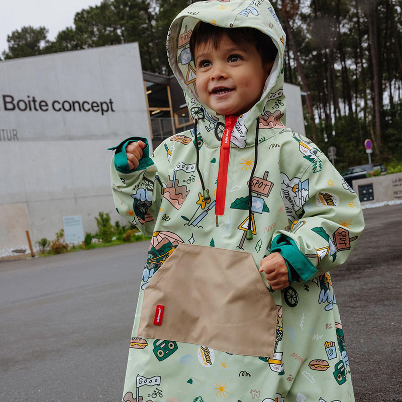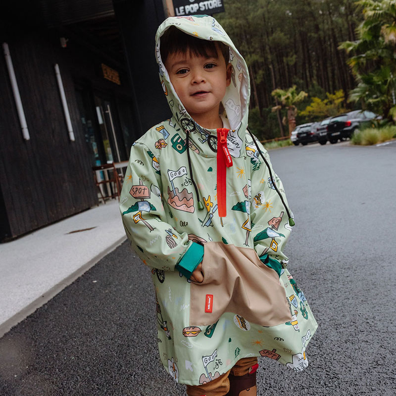 Горная тематика для маленьких искателей приключений. Прочная водонепроницаемая ткань выдерживает активное использование. Капюшон регулируется шнурком для плотной посадки. Широкий крой позволяет носить пончо с рюкзаком под ним. Легко упаковывается, не занимает много места. Подходит для походов, прогулок и поездок за город.