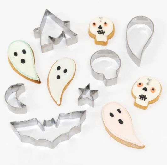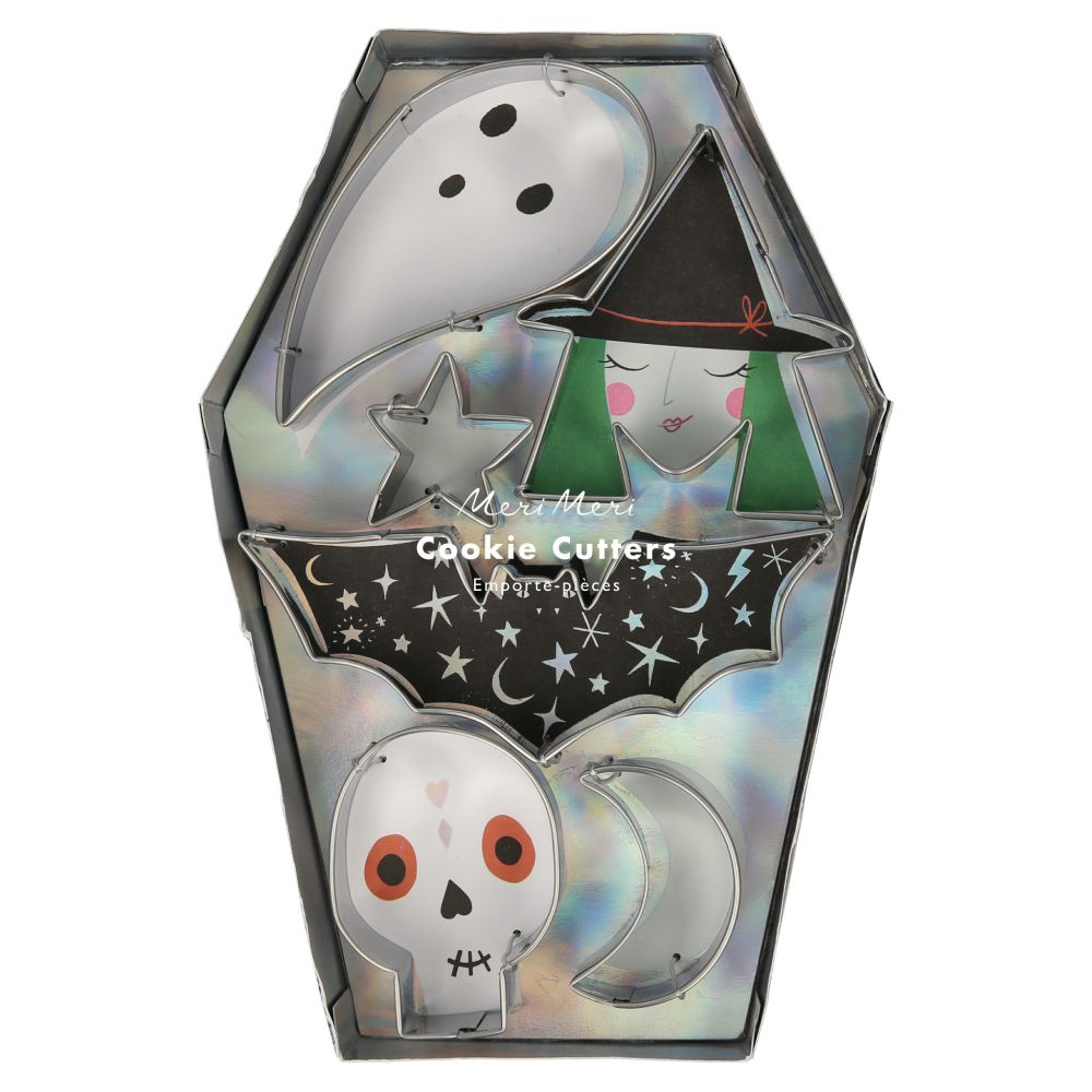В состав этого оригинального набора формочек входит шесть штук вырубок, выполненных из высококачественной нержавеющей стали, не содержащей вредного никеля. Лицо ведьмочки, череп, привидение-капелька, летучая мышь, звёздочка и месяц помогут вам испечь красивое печенье к Хэллоуину. Формочки упакованы в подарочную коробку в тематическом стиле.