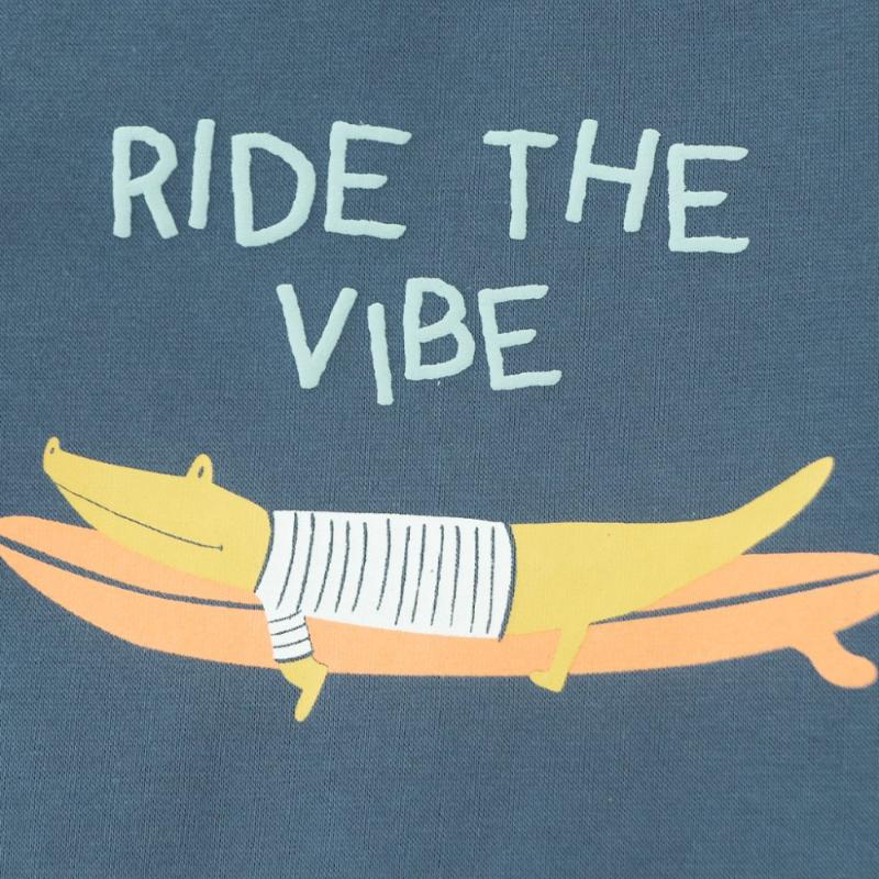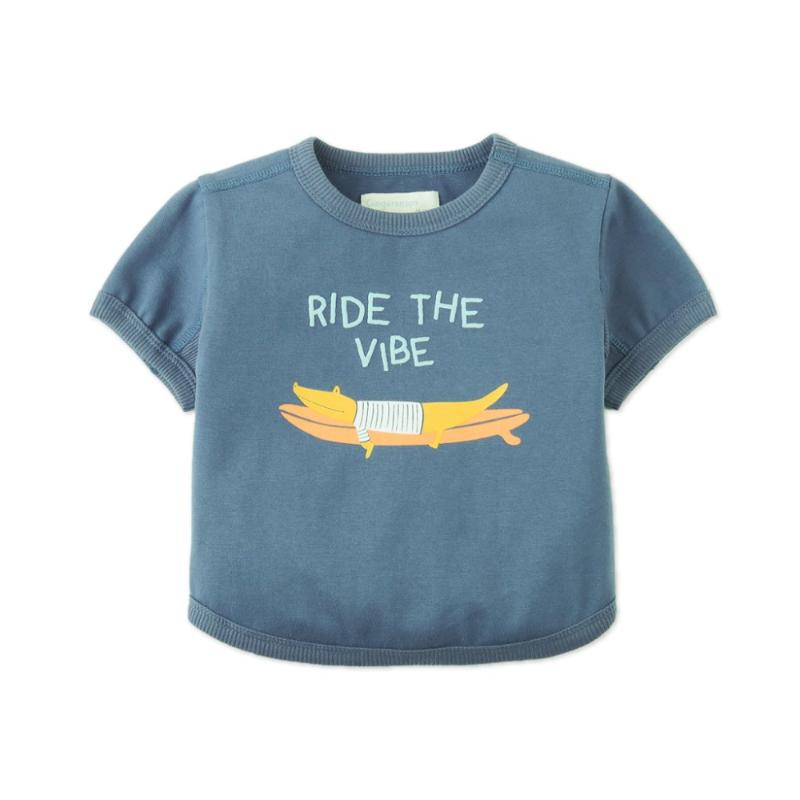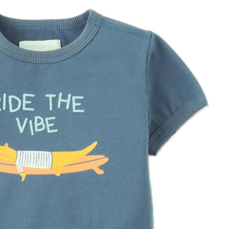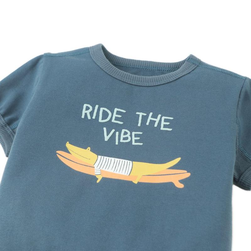 Широкий свободный крой-бочонок дает больше пространства для движений и при этом выглядит очень современно. На груди — принт с серфингистом-крокодилом, который сразу привлекает внимание. Ткань с небольшим добавлением эластана хорошо тянется и не теряет форму после стирки. Голубой туман — универсальный оттенок, который легко впишется в любой летний гардероб.