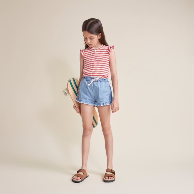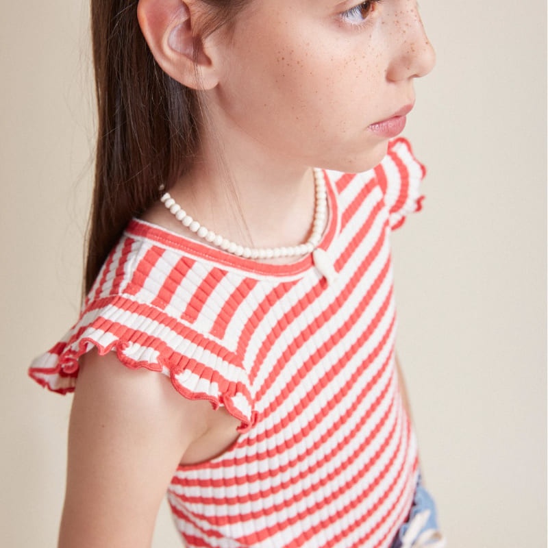 Эта футболка с коралловыми полосками — красочный и стильный выбор для любой теплой погоды. Выполненная из качественного трикотажа в рубчик, она обеспечивает комфорт и стиль на весь день. Рельефная текстура ткани добавляет оригинальности, а универсальный фасон подходит как для прогулок, так и для активных игр. Коралловые полоски придают изделию выразительность, а мягкость ткани не ограничивает движения, создавая ощущение легкости.
