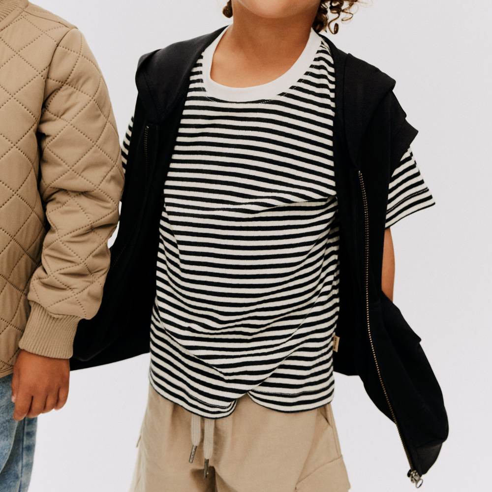 Эта футболка с темно-синими полосками станет отличным дополнением к любому гардеробу. Мягкий и приятный материал обеспечивает комфорт и долговечность, а универсальный дизайн делает футболку подходящей как для активных дней, так и для более спокойных образов. Стильные полоски на ткани добавляют интересный акцент, а удобный крой позволяет свободно двигаться. Она легко комбинируется с различными штанами, джинсами и шортами для создания стильных комплектов.