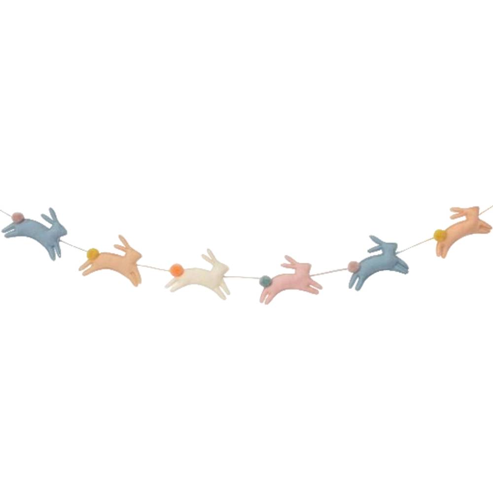 Восемь набитых кроликов из фетра в пастельных тонах — у каждого свой цвет и помпон-хвостик в тон. Нанизаны на натуральный шнур, поставляются в мешочке из органзы с золотым тиснением. Можно повесить на стену, растянуть над столом или просто оставить на полке — в любом виде смотрится как декор, а не как украшение к празднику.
