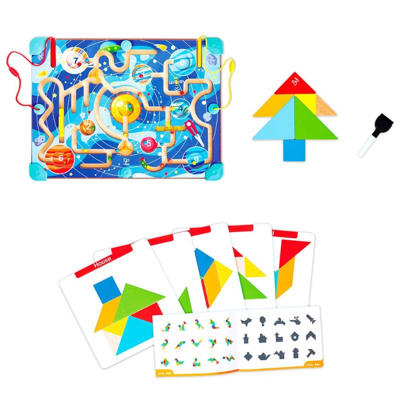 В комплекте: маркер для белой доски, магнитный лабиринт, 7 деревянных пазлов, 5 бумажных карточек, книга с заданиями.