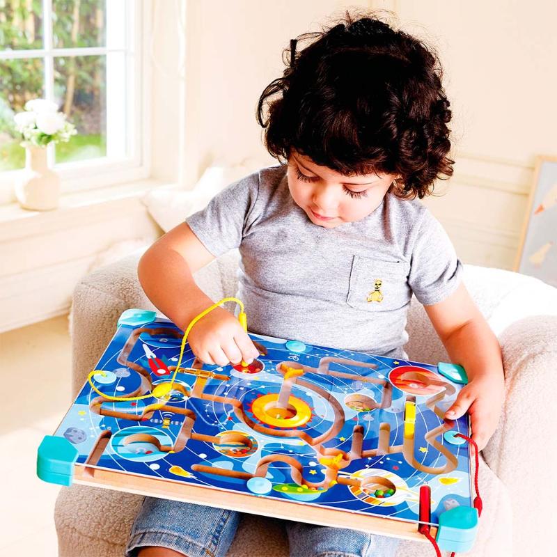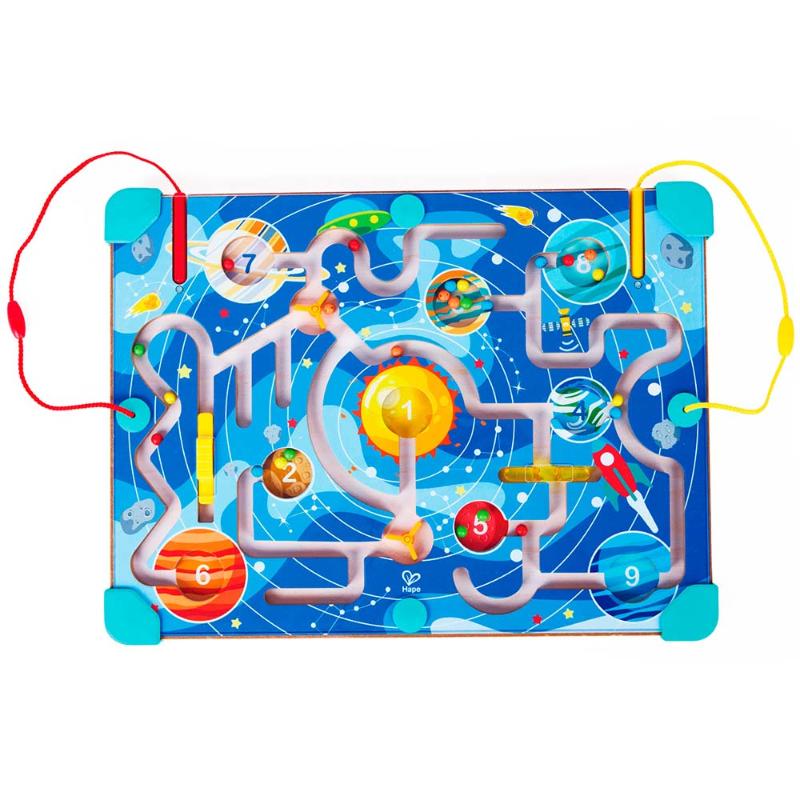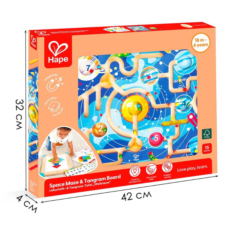 Двойное приключение в одной игрушке! С одной стороны — захватывающий магнитный лабиринт, где нужно провести шарики через космические препятствия. С другой — доска для рисования и складывания танграма с деревянными фигурками. Решай головоломки, рисуй фломастером и стирай сколько хочешь. Два мира игры и развития в одном удобном планшете. Космос ждёт!