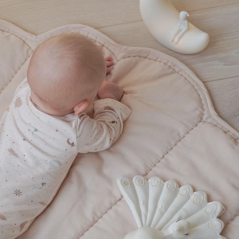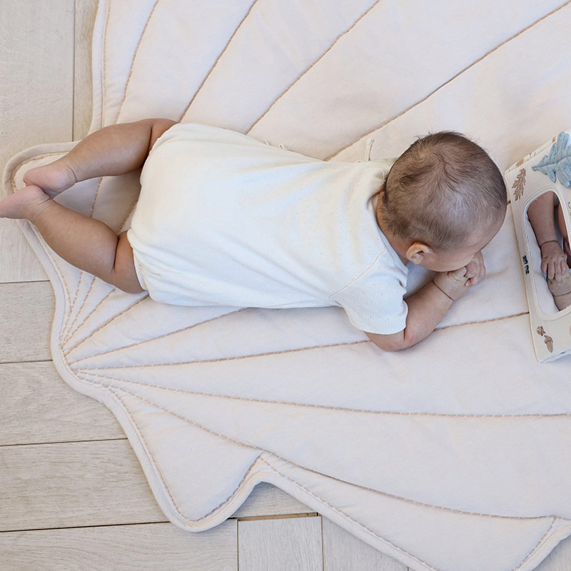 Элегантный коврик в форме морской ракушки добавляет изящества детской. Стёганая поверхность из органического хлопка нежно поддерживает малыша во время игр и отдыха. Миндальный оттенок создает спокойную атмосферу, а необычный силуэт стимулирует воображение. Используйте под мобилем, для tummy time или просто как красивый элемент интерьера. Легко стирается и сохраняет форму после стирок.