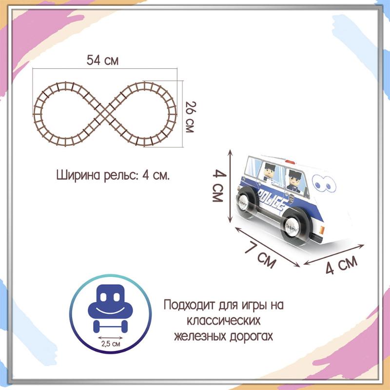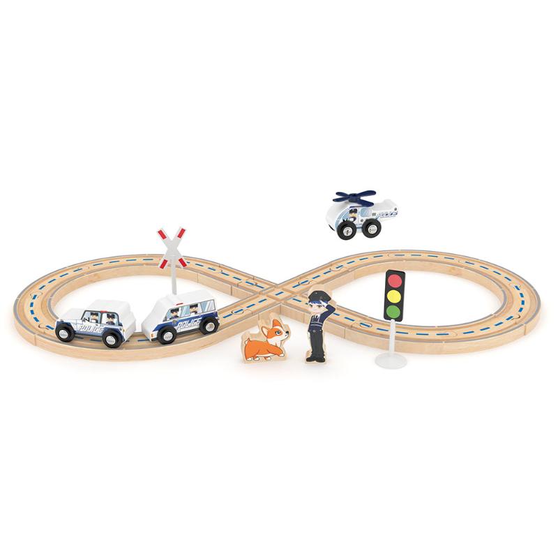 Полицейский участок соединён с рельсами — и это меняет правила игры. Патрульные машины могут отправиться в погоню по дороге, а поезд доставит подкрепление. Деревянная конструкция включает отделение с деталями интерьера, фигурки полицейских и транспорт. Магнитные вагоны легко сцепляются. Ребёнок научится выстраивать сюжеты про порядок и справедливость, развивая логику и координацию. Набор совместим с другими треками Hape, что открывает простор для творчества и масштабных операций.