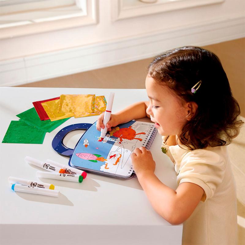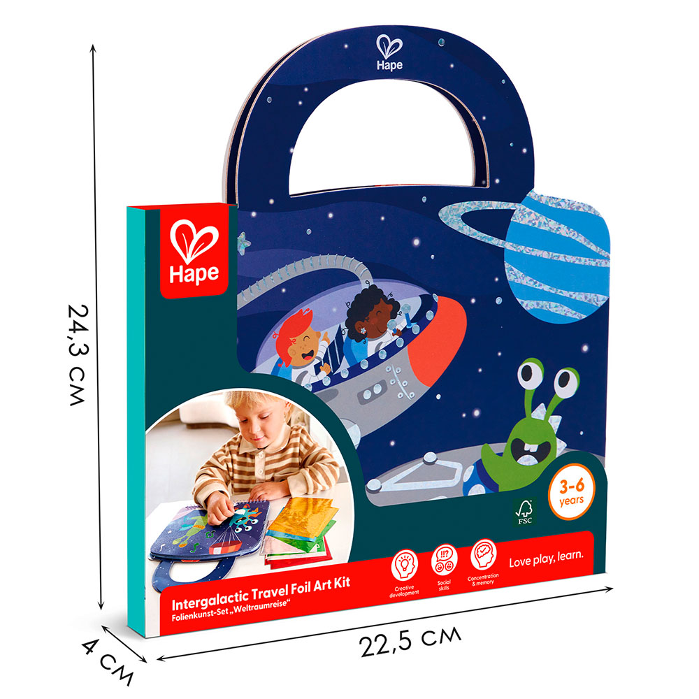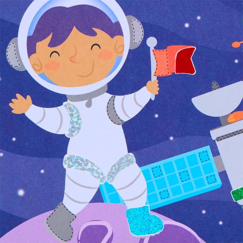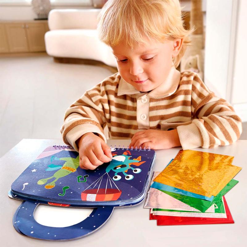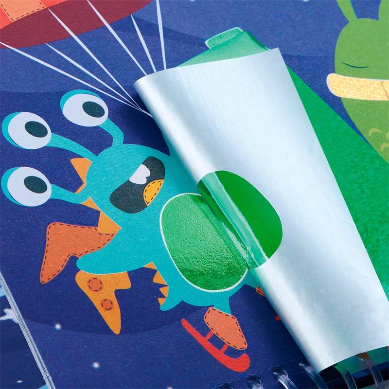 Создавай сверкающие космические картины! Отклеивай цветные кусочки фольги и приклеивай их на специальные контуры — так просто, что справится даже малыш. Планеты, ракеты и звёзды переливаются и блестят, как настоящие. Альбом удобно брать с собой благодаря ручкам. Почувствуй себя художником космоса и укрась галактику своими руками. Двенадцать листов фольги ждут тебя.