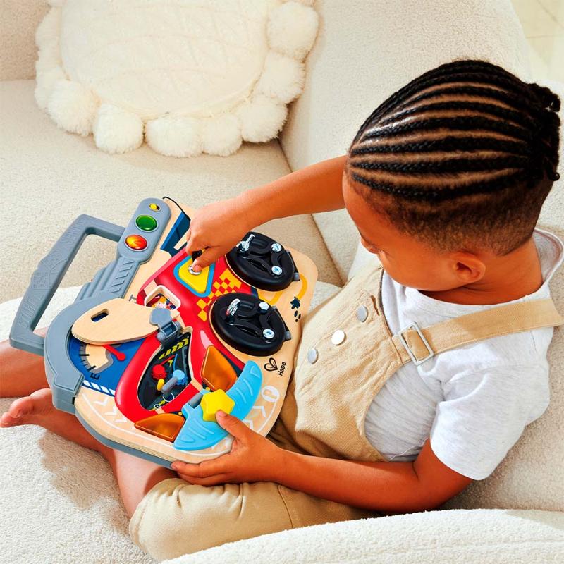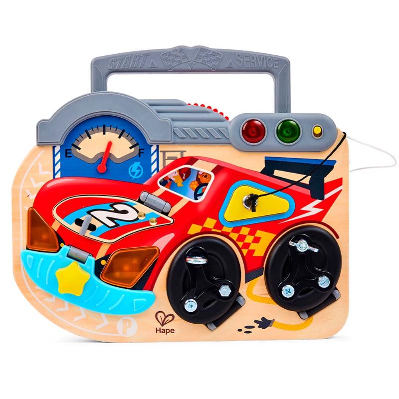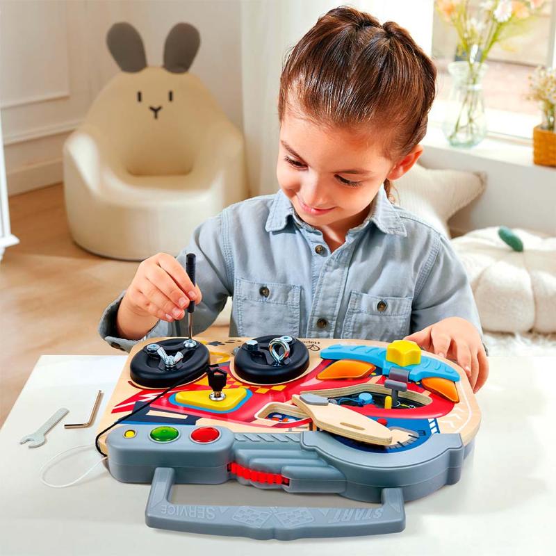 Добро пожаловать в автомастерскую! Крути винтики настоящими инструментами, открывай капот мотора, включай светофор и чини гоночную машину. Каждая деталь на этой игровой панели работает и двигается — совсем как в настоящем автосервисе. Развивай ловкость пальчиков, изучай, как устроены машины, и чувствуй себя опытным механиком. Ремонт ещё никогда не был таким весёлым.