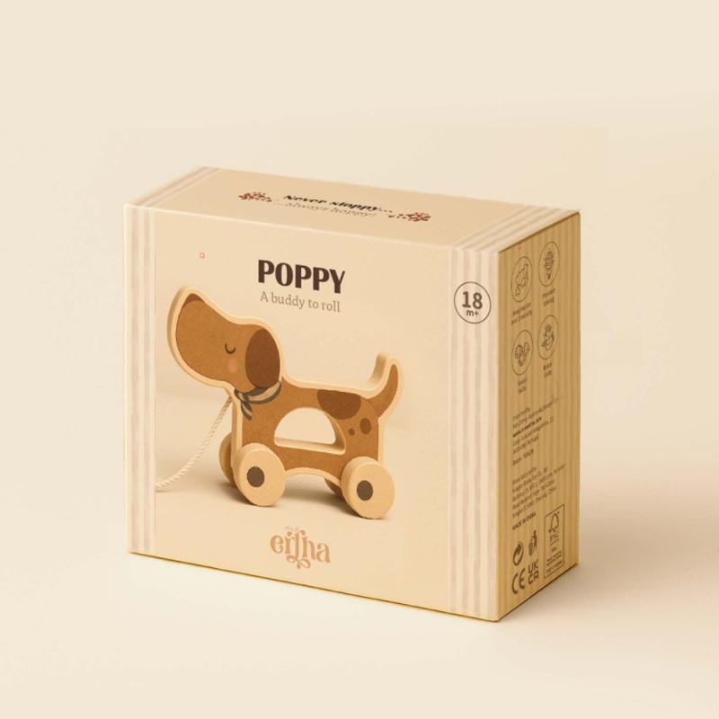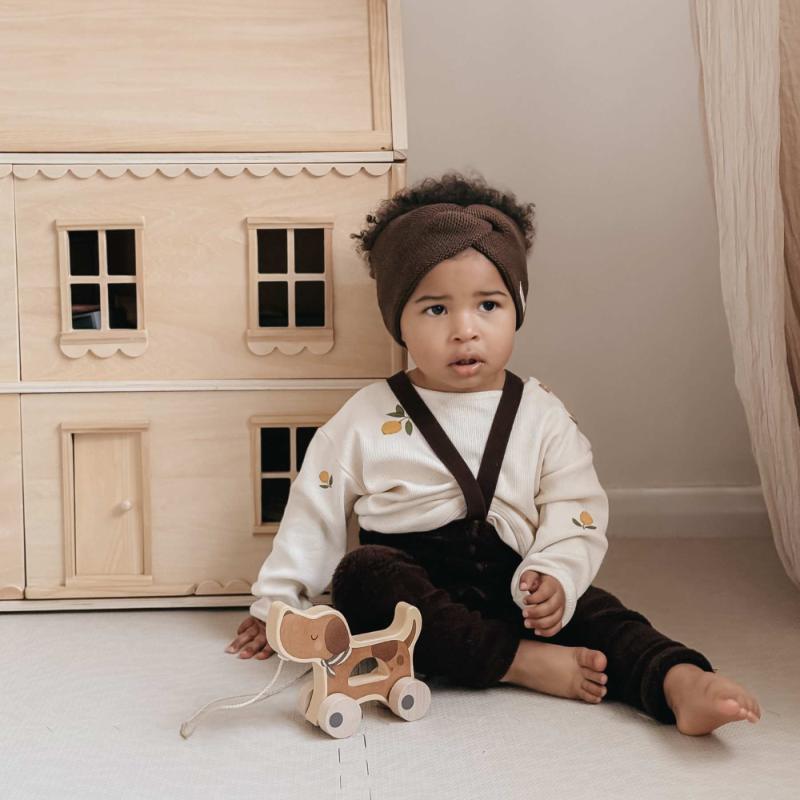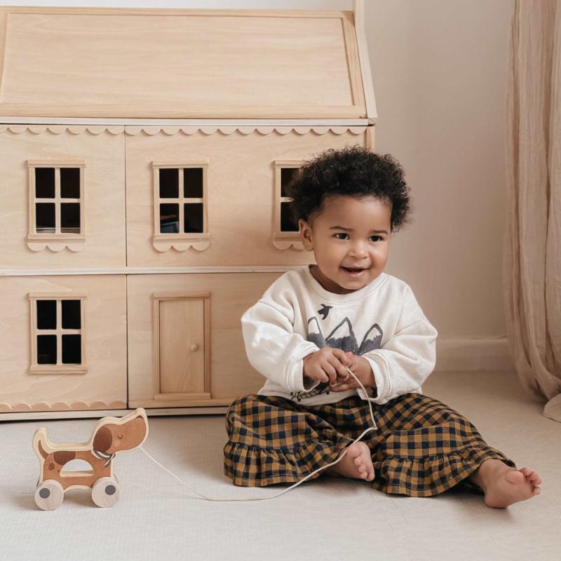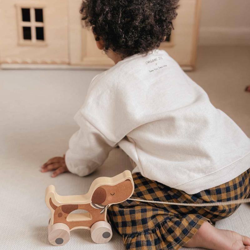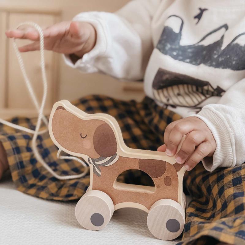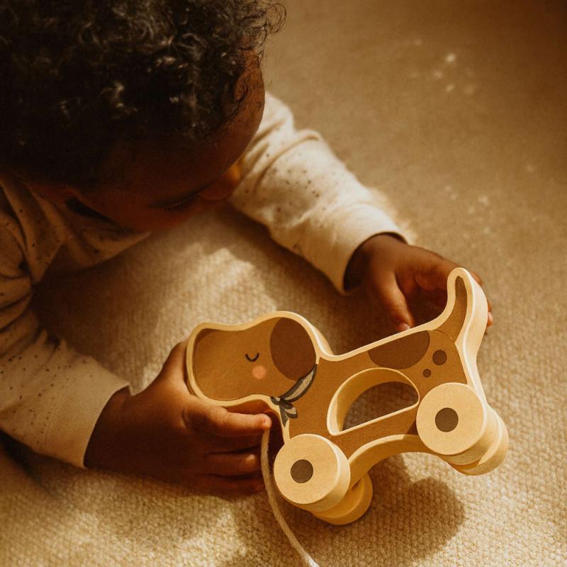 Деревянный щенок на гладких колёсиках — его можно катить за собой или толкать впереди во время прогулки по дому. Симпатичная мордочка, устойчивая конструкция, ничего лишнего. Сделан из переработанного дерева с нетоксичной краской на водной основе. Хорошо подходит для детей, которые только начинают уверенно ходить.