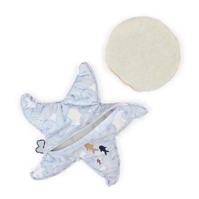 Игрушка-грелка в форме морской звезды с натуральным эффектом тепла и холода для облегчения детских недомоганий с рождения. Имеет съемный чехол и съемный мешочек, наполненный глиняными шариками и цветами лаванды. Разогрейте мешочек в микроволновке или охладите в морозильнике по необходимости. Доступ к мешочку защищен системой велкро для безопасного использования. Выполнена из мягкого меха, украшена принтом "Танец волн" с вышивкой рыбок, напоминающим о спокойствии морских глубин и волне благополучия. Успокаивающее выражение мордочки звездочки дополняет эффект. Размер идеален для согревания ребенка в кроватке. Без мешочка превращается в обычный комфортера для объятий. Лаванда помогает засыпанию благодаря успокаивающим свойствам. Подходит с рождения.