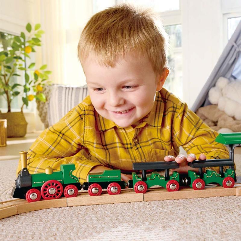 Отправляйся в путешествие на настоящем паровозе с дымовой трубой! Этот стильный ретро-поезд выглядит как из старинной книжки. Прицепляй вагоны, загружай грузы и пассажиров, отправляйся в дальние края. Складная труба добавляет поезду особый шарм. Придумывай маршруты, устраивай станции и перевози всё на свете. Чух-чух, поехали в захватывающее приключение!