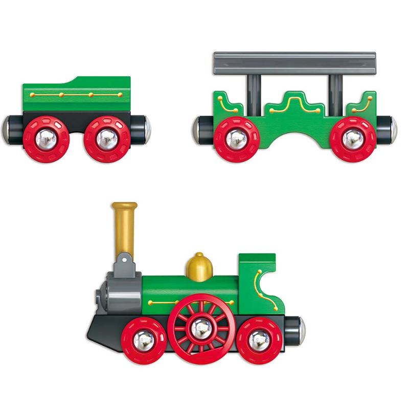 В комплекте: локомотив с механической тягой, 3 вагона для перевозки грузов и пассажиров.