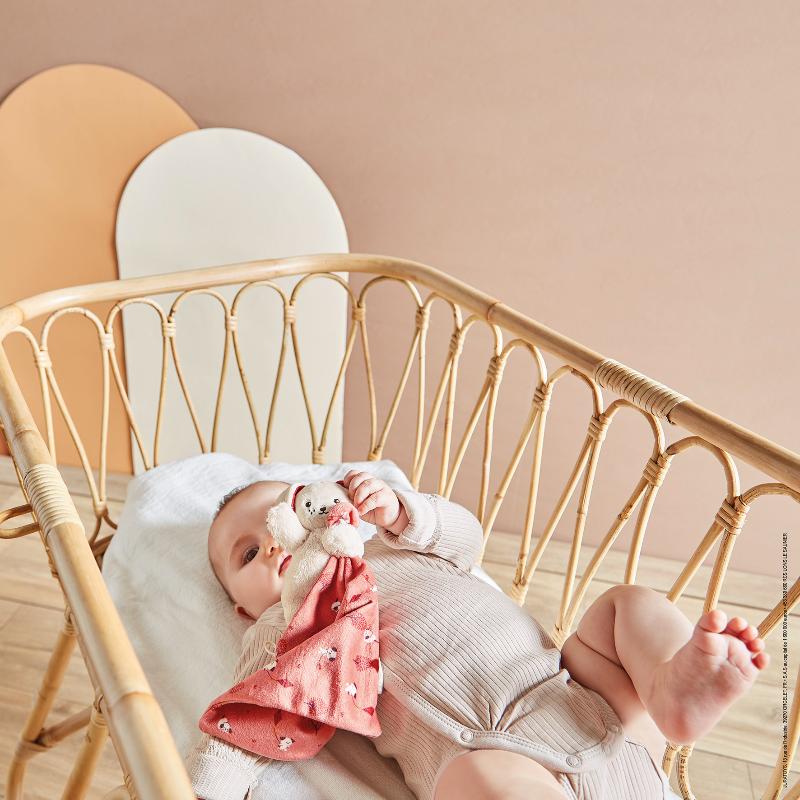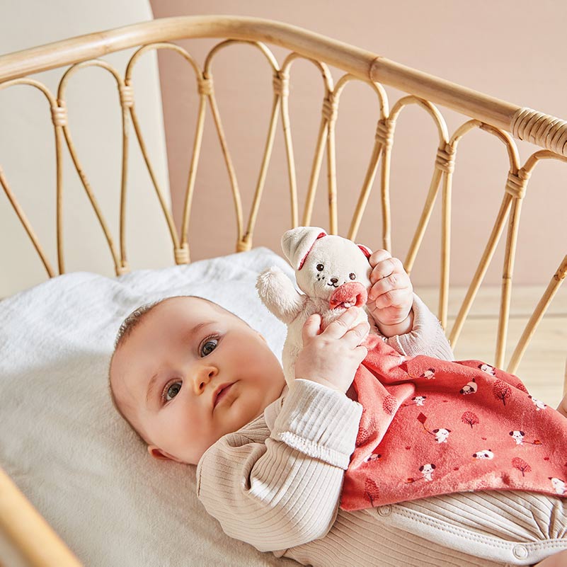 Очаровательная плюшевая собачка кирпично-красного цвета держит квадратный комфортер размером 18х18 см из коллекции Carré Douceur. Сама собачка высотой 14 см мягкая как облако, легко захватывается маленькими ручками и покоряет всю семью трогательной мордочкой. На квадратном комфортере нанесен деликатный принт с собачкой, играющей в саду — можно рассказывать истории или наблюдать, как малыш с любопытством разглядывает иллюстрации по мере взросления. Квадратный комфортер малыш будет прижимать к себе для успокоения, а также может укутывать им собачку как теплым одеялом. Ушки собаки подобраны в тон комфортеру. Теплые розово-терракотово-оранжевые оттенки, безупречная мягкость и поэтичный принт делают этот подарок идеальным. Подходит с рождения.