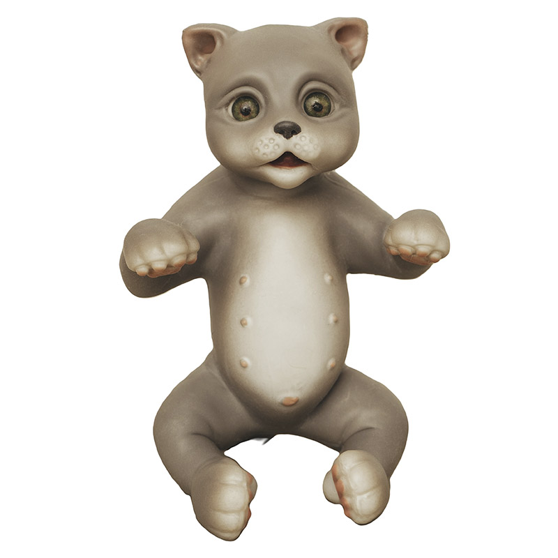Серый котик с выразительной мордочкой и акриловыми глазами. Выглядит как настоящий — видны все складочки кожи, усики, подушечки на лапках. Сделан из мягкого силикона, который не холодный, а теплый в руках. Каждая игрушка раскрашена мастером, поэтому узор может чуть отличаться. Ребенок может его гладить, обнимать, играть в заботу о питомце. Развивает нежность и ответственность.
