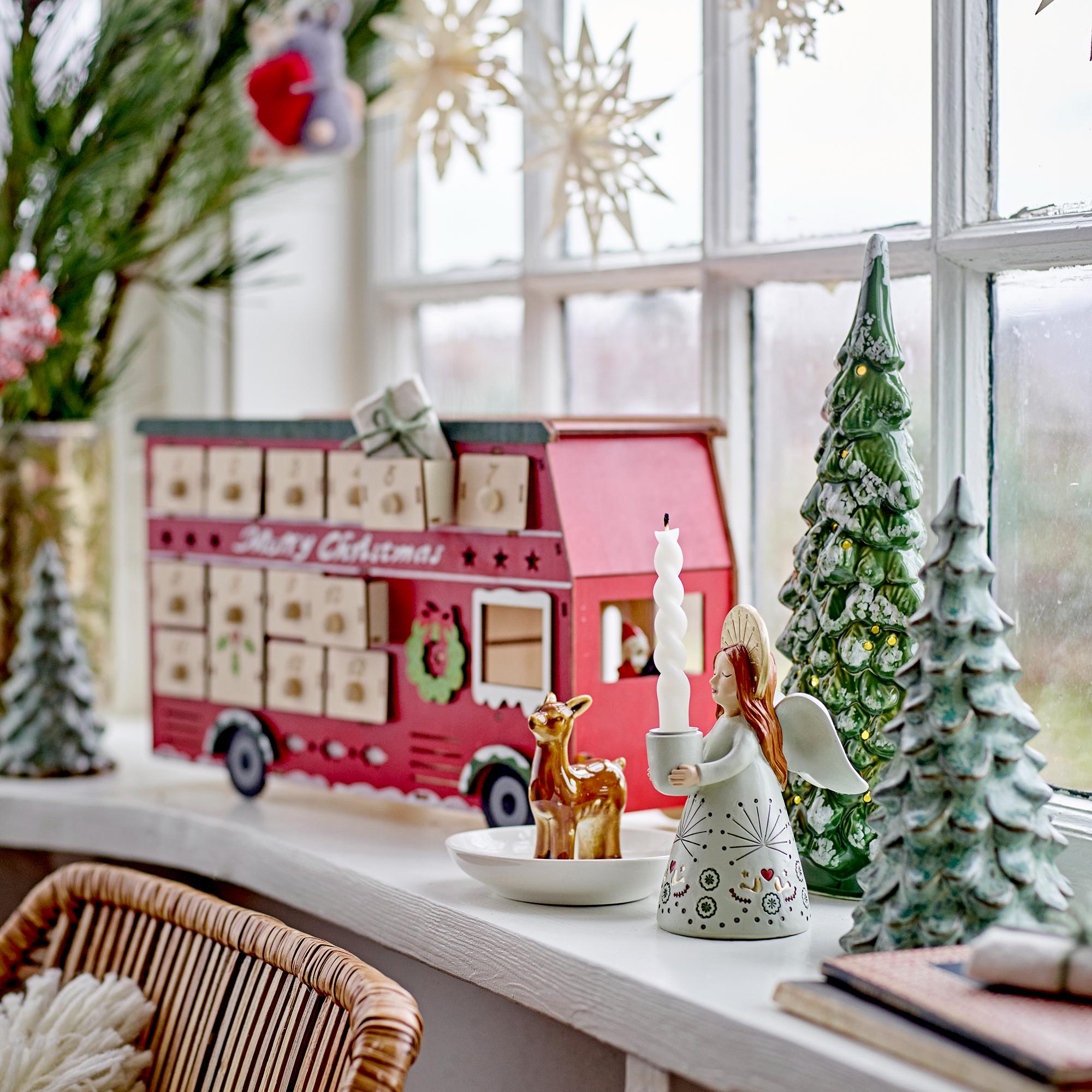Рождественский автобус везёт праздник прямо к вам. Красная фанерная конструкция с 24 маленькими ящичками для сюрпризов. Встроенная подсветка создаёт волшебную атмосферу в декабрьские вечера. Размер 37×21×11,5 см делает его центральным элементом рождественского декора. Ностальгический дизайн с современным функционалом — календарь, который хочется доставать каждый год и наполнять новыми маленькими радостями.