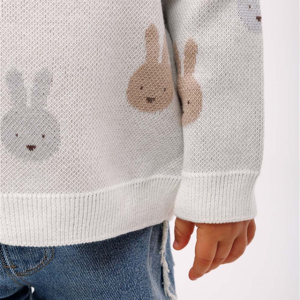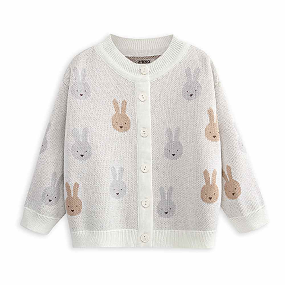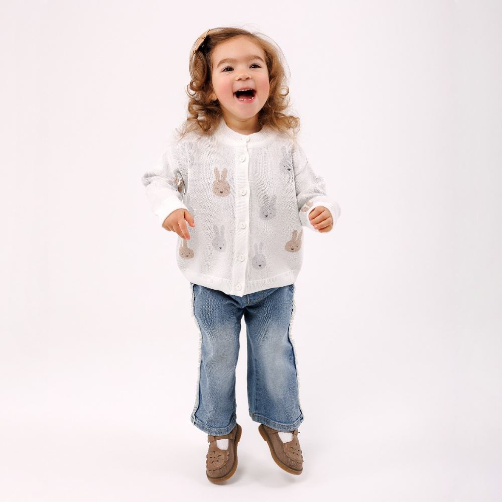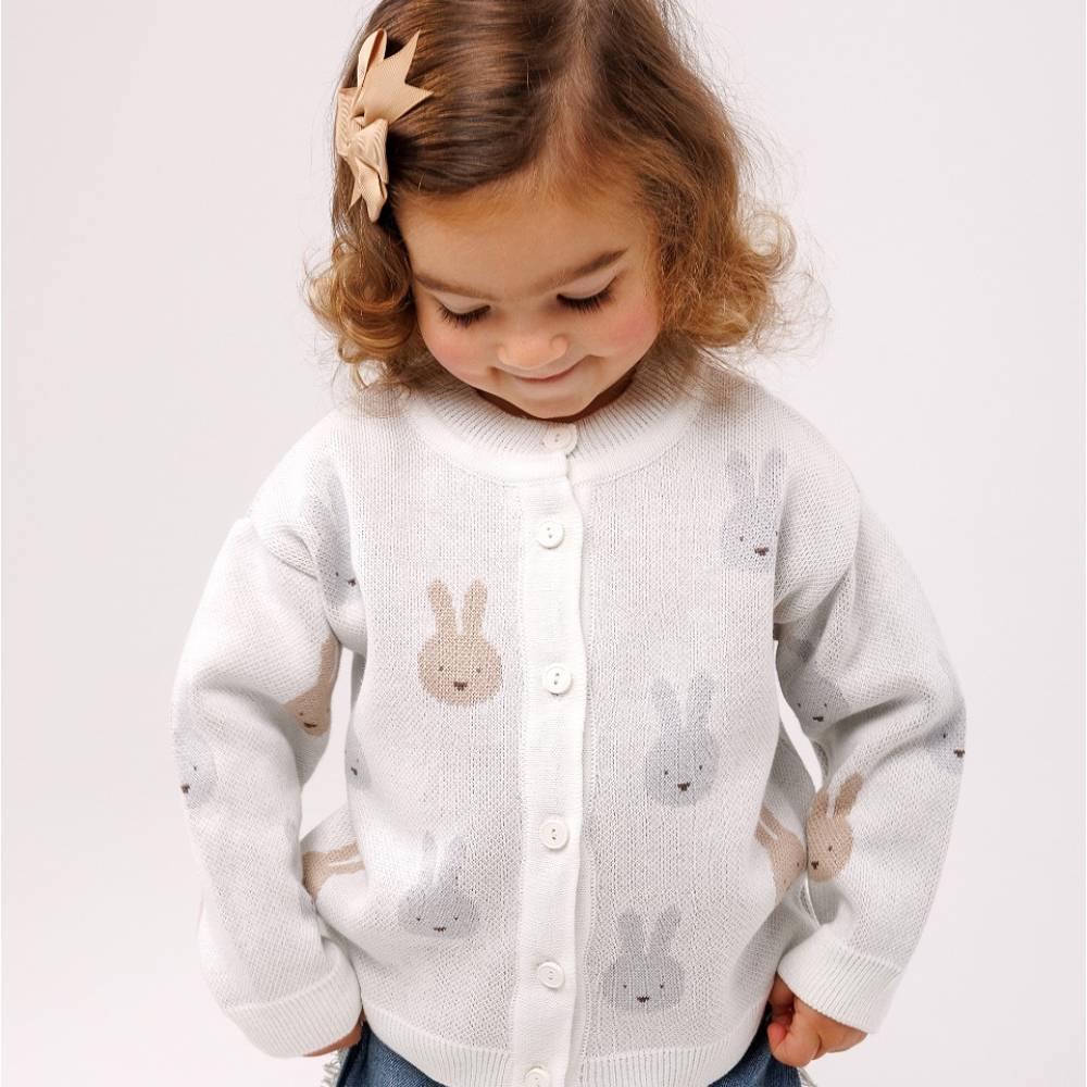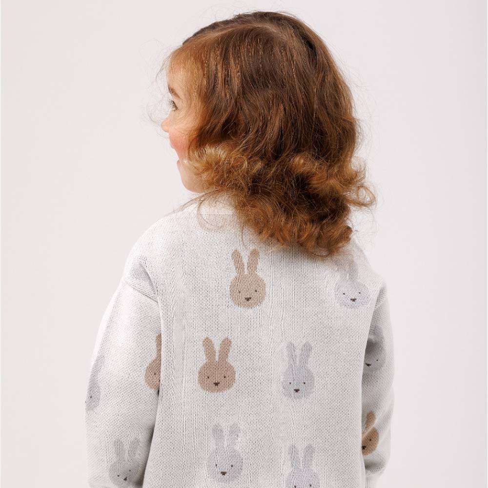 В этом кардигане есть что-то от любимой сказки. Вязаная текстура придаёт образу особую теплоту, а милый рисунок с зайчиками вызывает улыбку даже в пасмурный день. Кардиган удобно надевать поверх футболки или водолазки, он не колется и не сковывает движений. Такое изделие словно создано для первых прогулок в парк или уютных вечеров дома с книгой и чашкой тёплого молока в руках родителей.
