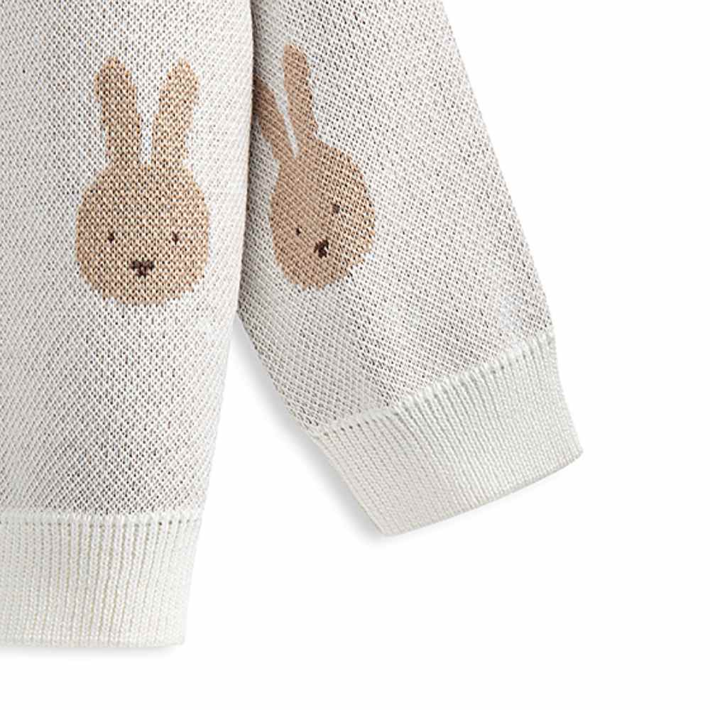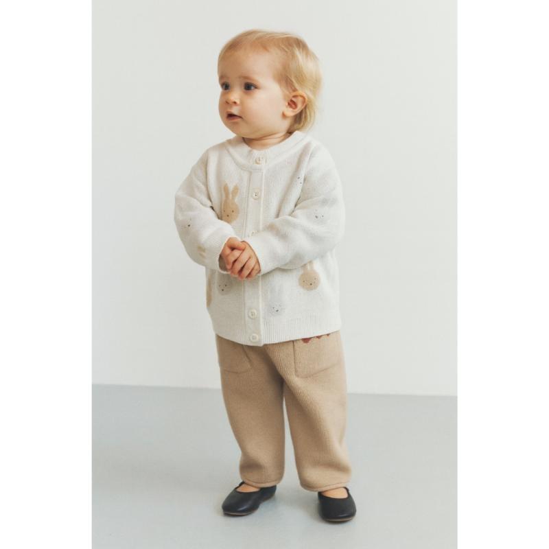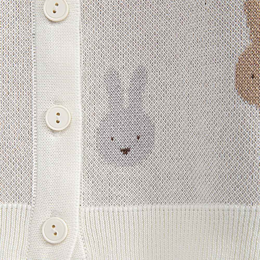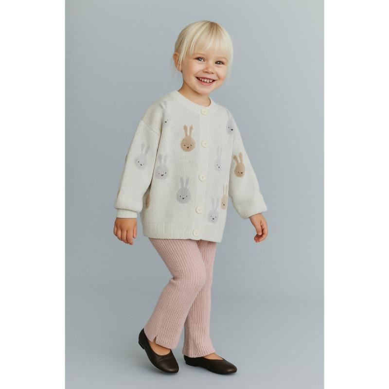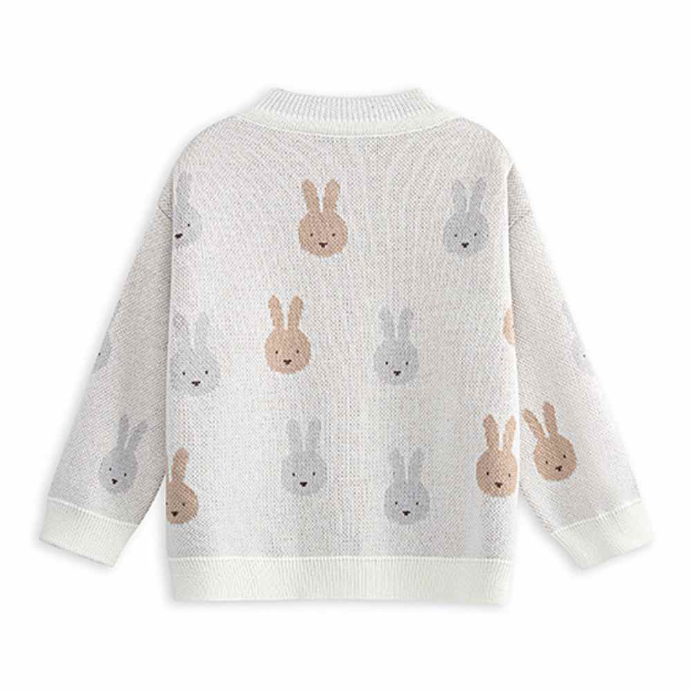 В этом кардигане есть что-то от любимой сказки. Вязаная текстура придаёт образу особую теплоту, а милый рисунок с зайчиками вызывает улыбку даже в пасмурный день. Кардиган удобно надевать поверх футболки или водолазки, он не колется и не сковывает движений. Такое изделие словно создано для первых прогулок в парк или уютных вечеров дома с книгой и чашкой тёплого молока в руках родителей.