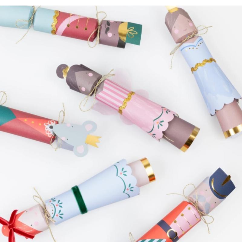 Традиция с балетным шармом! Шесть английских хлопушек украшены иллюстрациями Щелкунчика, создавая изысканную атмосферу. Внутри каждой — маленький сюрприз и бумажная корона. Тихое открытие (без хлопка) делает их безопасными для малышей и комфортными для всех. Идеальны для праздничного стола или в качестве подарков гостям. Классическая английская традиция в элегантном исполнении Meri Meri!