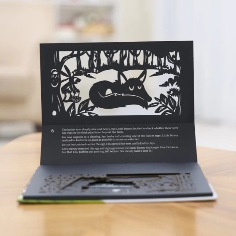 Волшебная история про кролика, который готовит сюрпризы к празднику! Эта книга-раскладушка превращается в декорации для домашнего спектакля: просто направьте свет фонарика на вырезанные иллюстрации, и тени заполнят всю стену. Ребёнок может рассказывать сказку сам или слушать вместе с вами. Плотный картон выдержит даже самые активные игры, а финальная сцена приглашает добавить собственных героев и продолжить приключение по-своему.