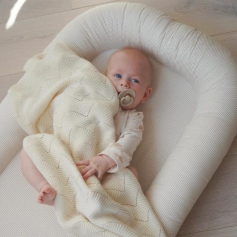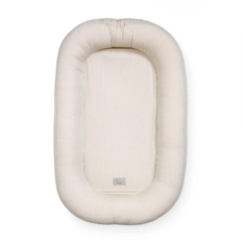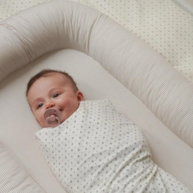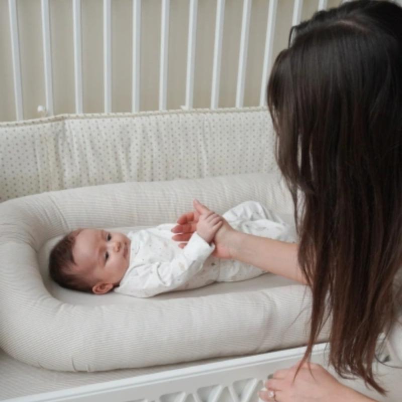 Кокон создает уютное ограниченное пространство, в котором малышу легче расслабиться и уснуть. Он помогает мягко зафиксировать положение тела и дает ощущение защищенности. Удобно использовать дома и брать с собой в поездки. Теплый полосатый рисунок в карамельных оттенках смотрится спокойно и подходит для нейтрального оформления детского пространства.