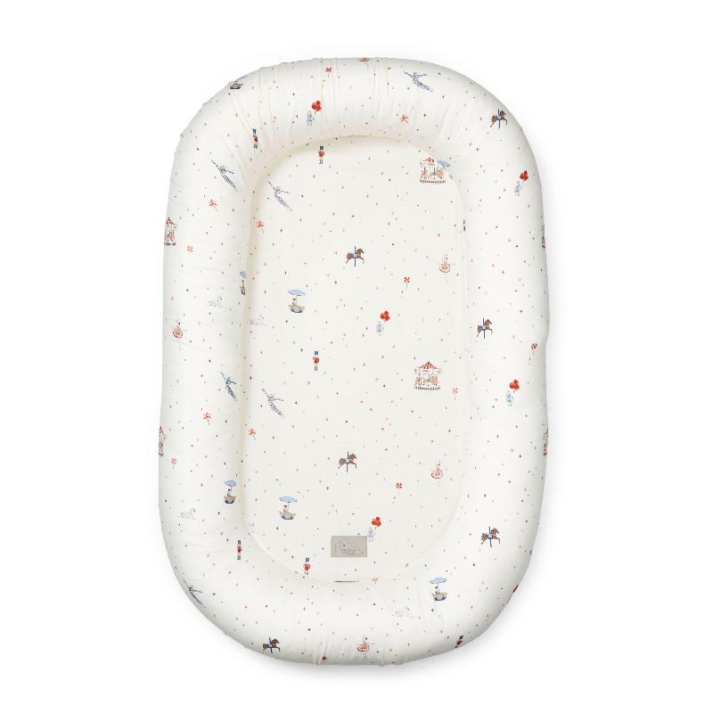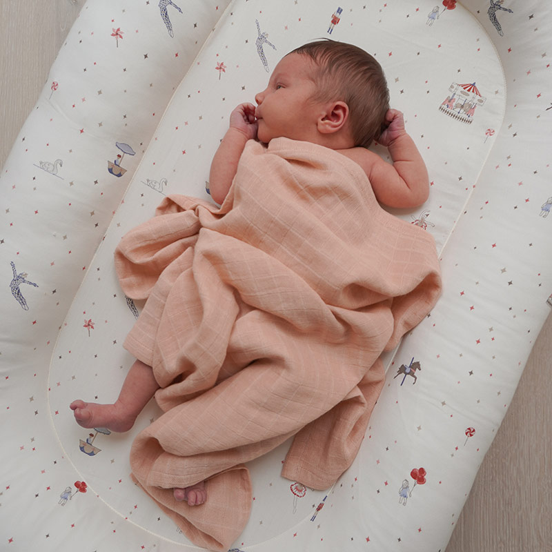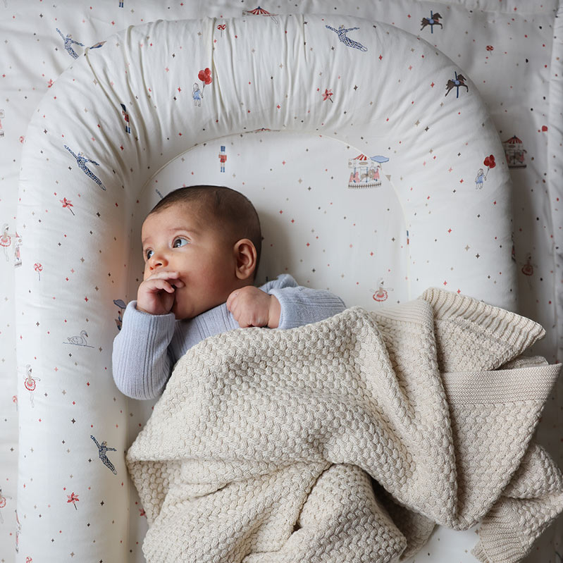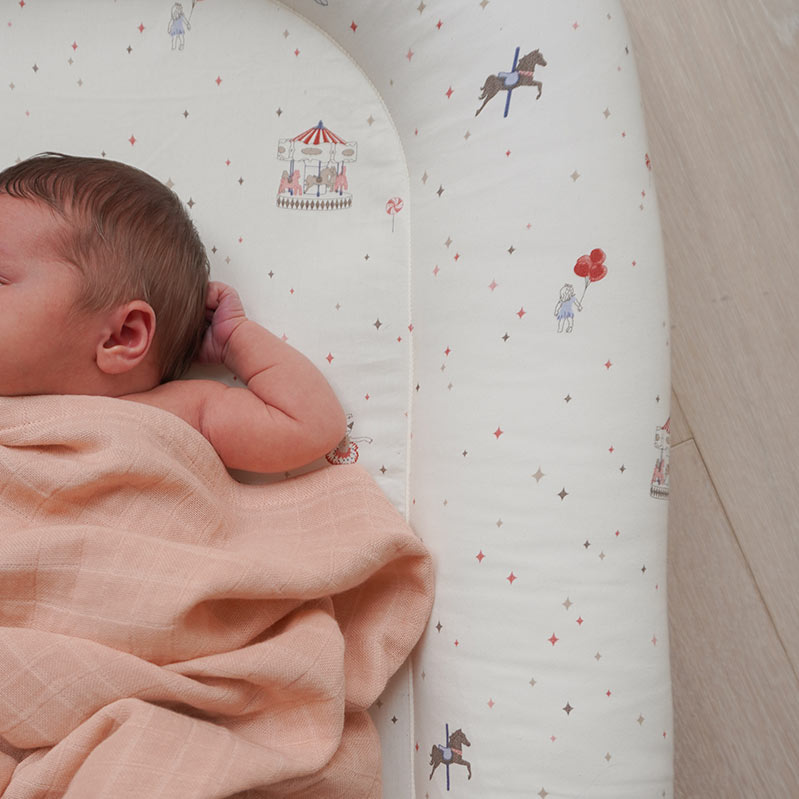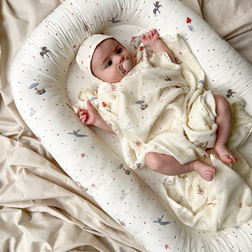Кокон из органического хлопка помогает малышу перейти от тесноты живота к большому пространству кроватки — мягко и постепенно. Устойчивое дно не прогибается, когда переносишь ребенка. Принт «Карусель» — один из самых узнаваемых в коллекции, теплый и ненавязчивый.