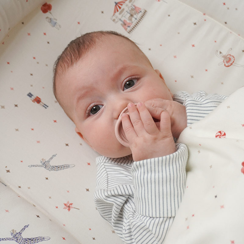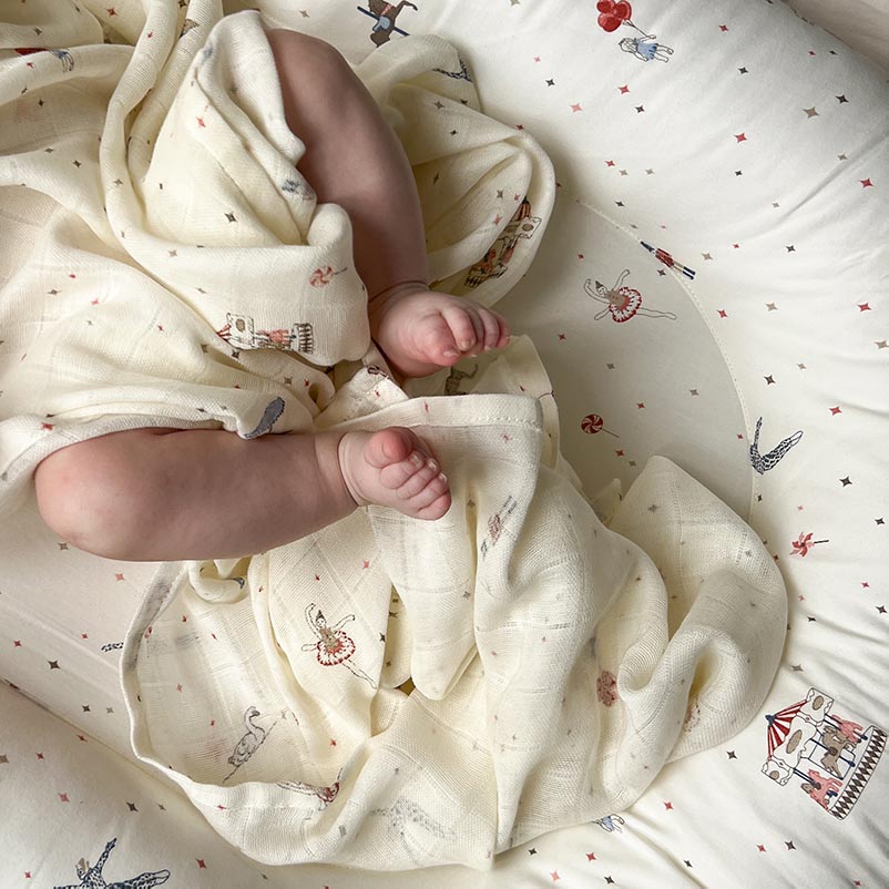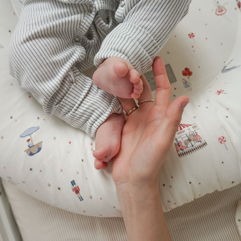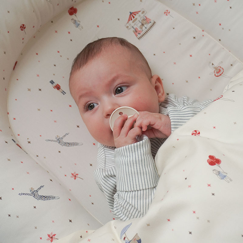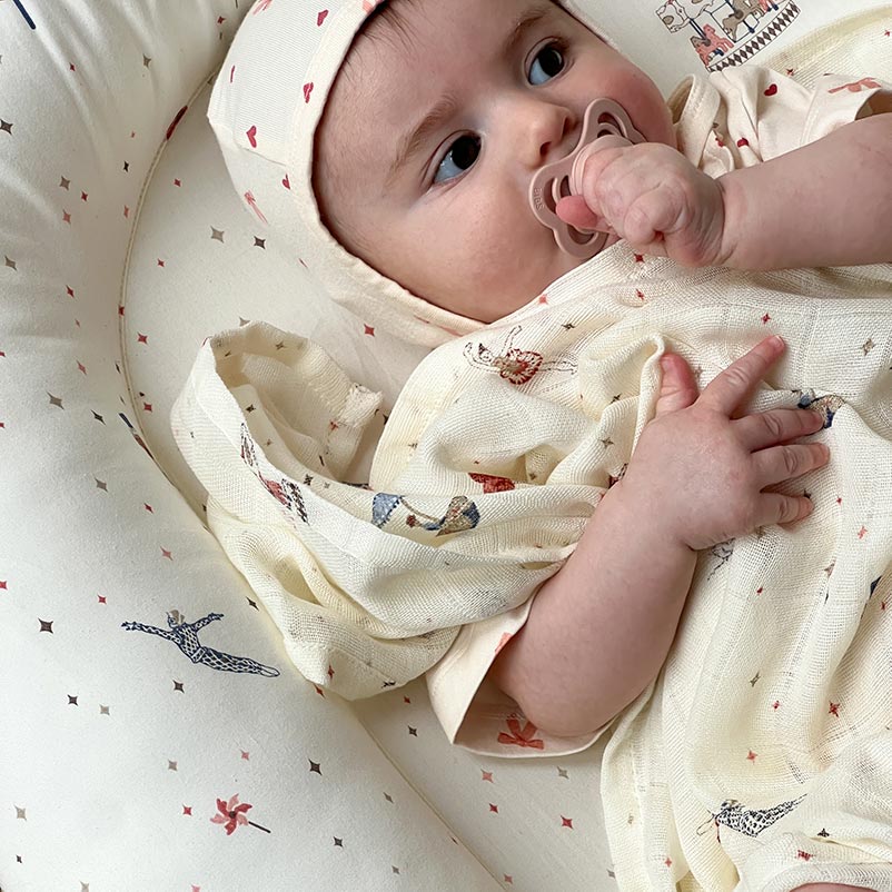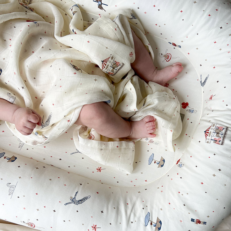 Кокон из органического хлопка помогает малышу перейти от тесноты живота к большому пространству кроватки — мягко и постепенно. Устойчивое дно не прогибается, когда переносишь ребенка. Принт «Карусель» — один из самых узнаваемых в коллекции, теплый и ненавязчивый.