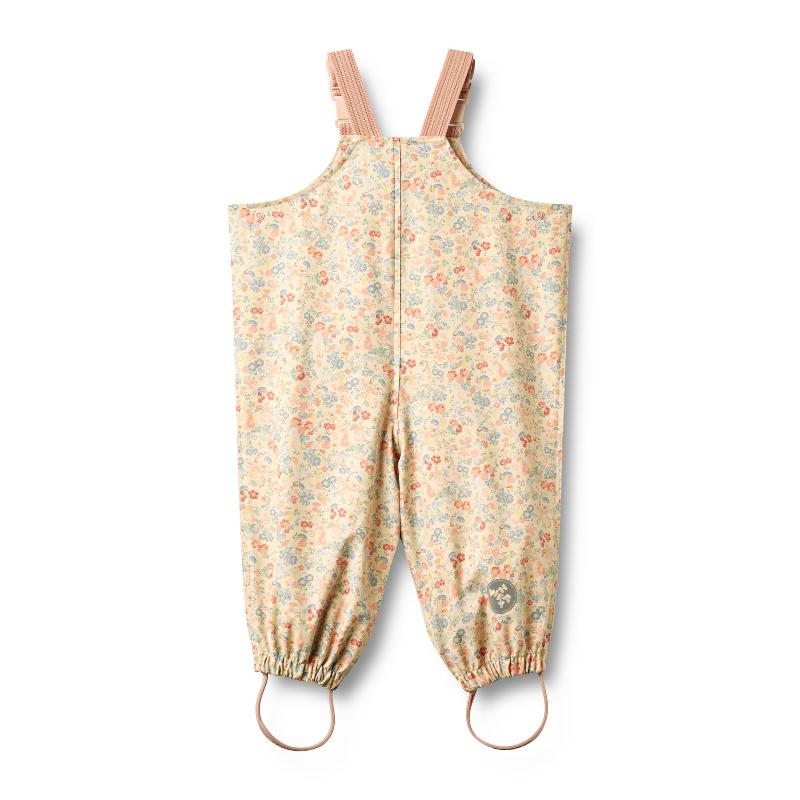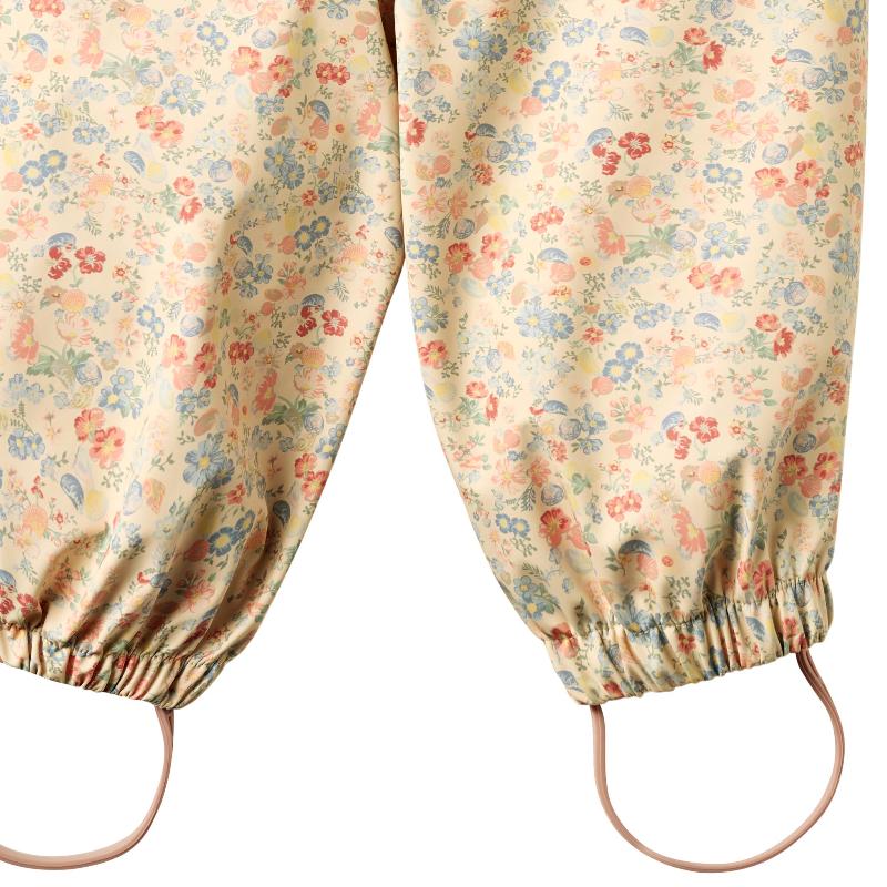 Дождевой полукомбинезон с ярким принтом цветов и ракушек. Лямки на пуговицах регулируются по высоте. Эластичный пояс для комфорта. Штрипки под обувь фиксируют длину штанин. Все швы проклеены герметично, вода не просочится. Светоотражатели для безопасности. Водонепроницаемая ткань отталкивает грязь, легко моется. Носится с курткой того же принта — вместе составляют стильный дождевой комплект. Для весны и осени в дождливую погоду. Можно прыгать по лужам без ограничений.