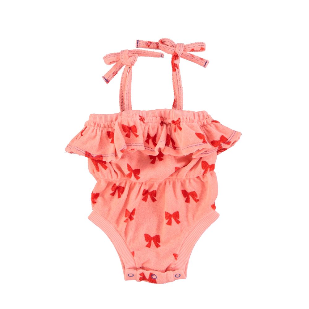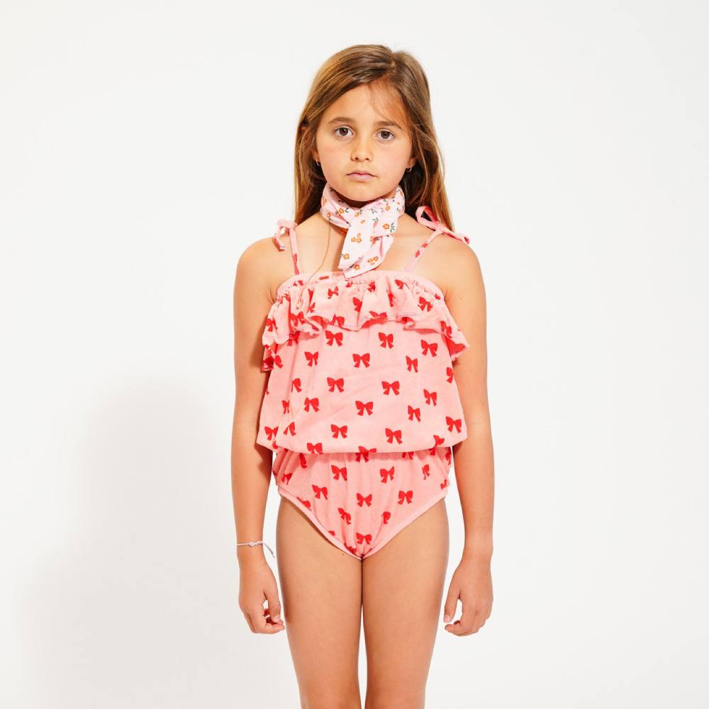 Этот плюшевый комбинезон с рюшами и красными бантами на розовом фоне — идеальный выбор для теплых дней. Он мягкий, удобный и легкий, прекрасно подходит для активных игр и прогулок на свежем воздухе. Рюши придают образу дополнительной уникальности, а нежный бантик добавляет особый акцент. Комбинезон легко сочетается с различными аксессуарами и обувью, создавая стильный летний наряд для вашего ребенка.