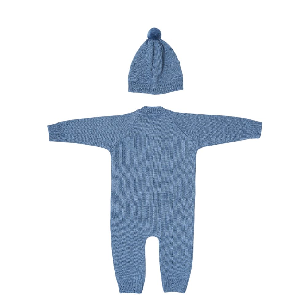 Гармония цвета и формы в этом комплекте читается с первого взгляда. Синий оттенок создаёт выразительный образ, а мягкая вязка добавляет уюта. Комбинезон не сковывает движений, легко надевается и снимается, а шапочка удобно фиксируется, не сползая даже при активных движениях. Такой набор подойдёт как для выхода, так и для домашнего уюта. Он словно говорит: «Я не только красивый, но и удобный».
