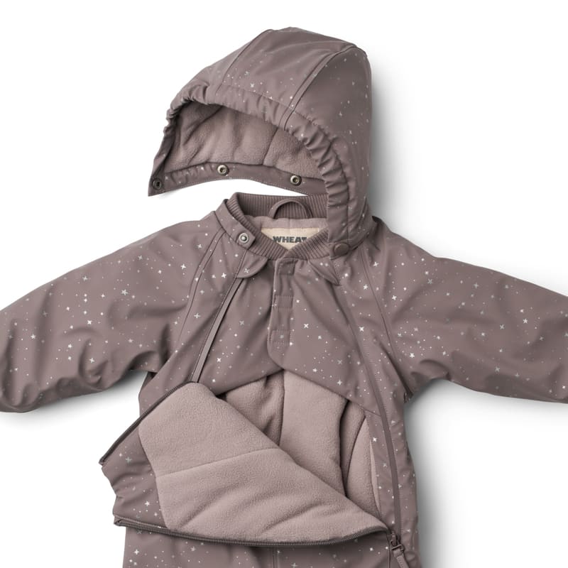 Тёплый зимний комбинезон с оригинальным принтом в виде звёзд на фоне глубокого пурпурного цвета словно отражает морозное ночное небо в горах. Надёжный утеплитель, ветро- и влагозащита создают комфорт в самые холодные дни. Продуманный крой с капюшоном и удобными застёжками помогает сохранять тепло и защищать малыша от ветра и снега. Эта модель отлично подойдёт для активных прогулок зимой и создаст уютный, стильный образ.